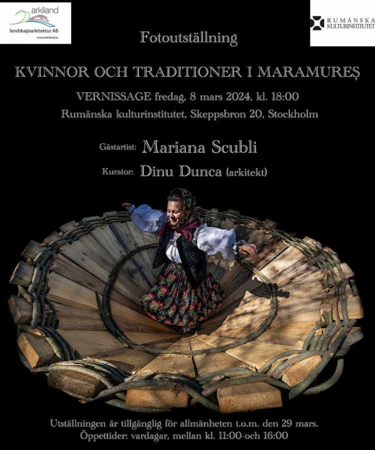 Expoziția „Tradiții și chipuri de femei din Maramureș‟, care va cuprinde aproximativ 100 de fotografii etnografice din zona de nord a României, va rămâne deschisă de luni până vineri, între orele 11.00-16.00, în perioada 8-29 martie 2024, în galeria ICR Stockholm (Skeppsbron 20).