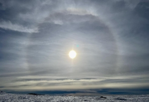 Este vorba despre haloul solar, surprins de această dată de profesorul sighetean Sorin Hotea. „Halou solar a apărut miercuri, 30 noiembrie, în jurul orei 11:45 în Munții Igniș, nu departe de vârful Țiganul (1222 m). După cum se poate vedea și din imagini, în acea zonă peisajul este unul autentic de iarnă”, arată Sorin Hotea.