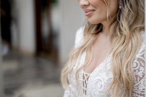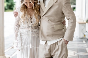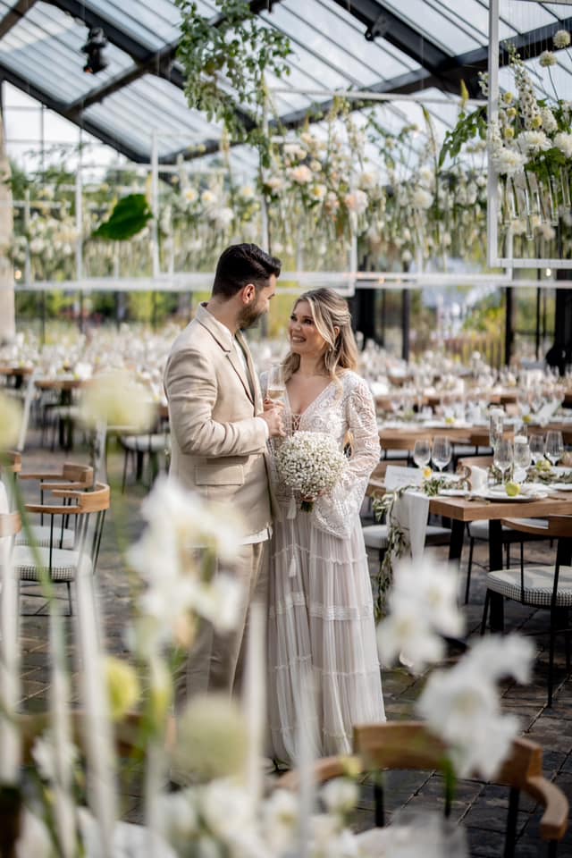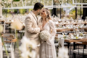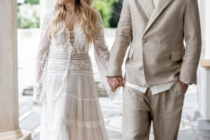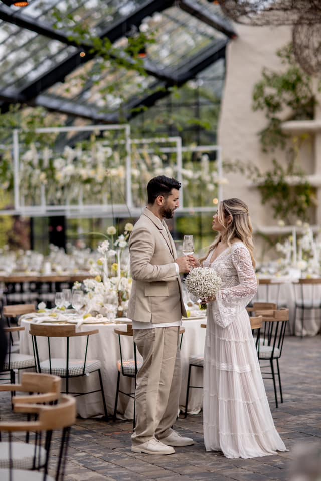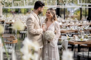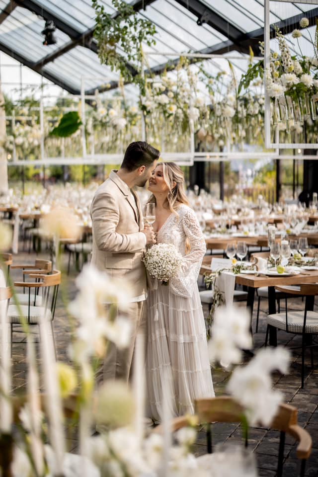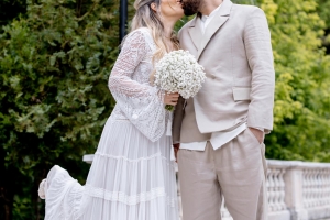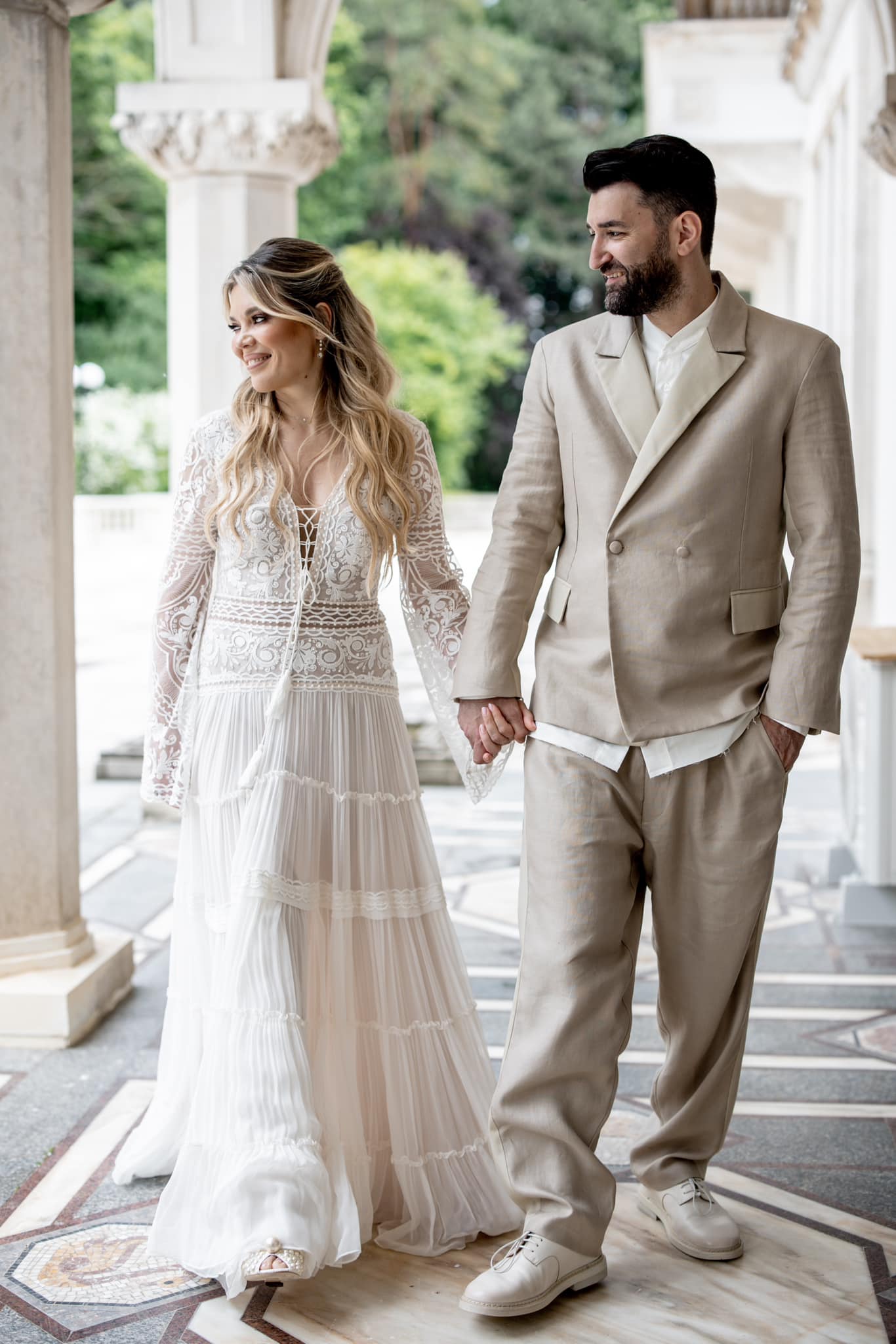 Gina Pistol a purtat la cununia civilă o rochie lungă, albă, vaporoasă și a avut un buchet de floarea miresei.
