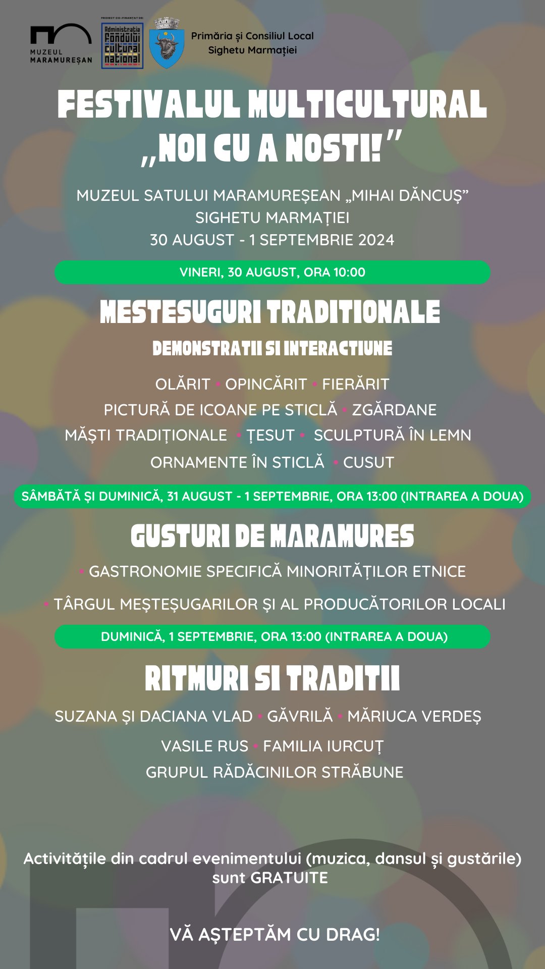 Muzeul Satului Maramureșean „Mihai Dăncuș” din Sighetu Marmației vă invita să participați la festivalul multicultural „Noi cu a noști!”, un eveniment care se va desfășura în perioada 30 august – 1 septembrie. Acesta face parte din cadrul proiectului cu același nume cofinanțat de Administrația Fondului Cultural Național (AFCN).