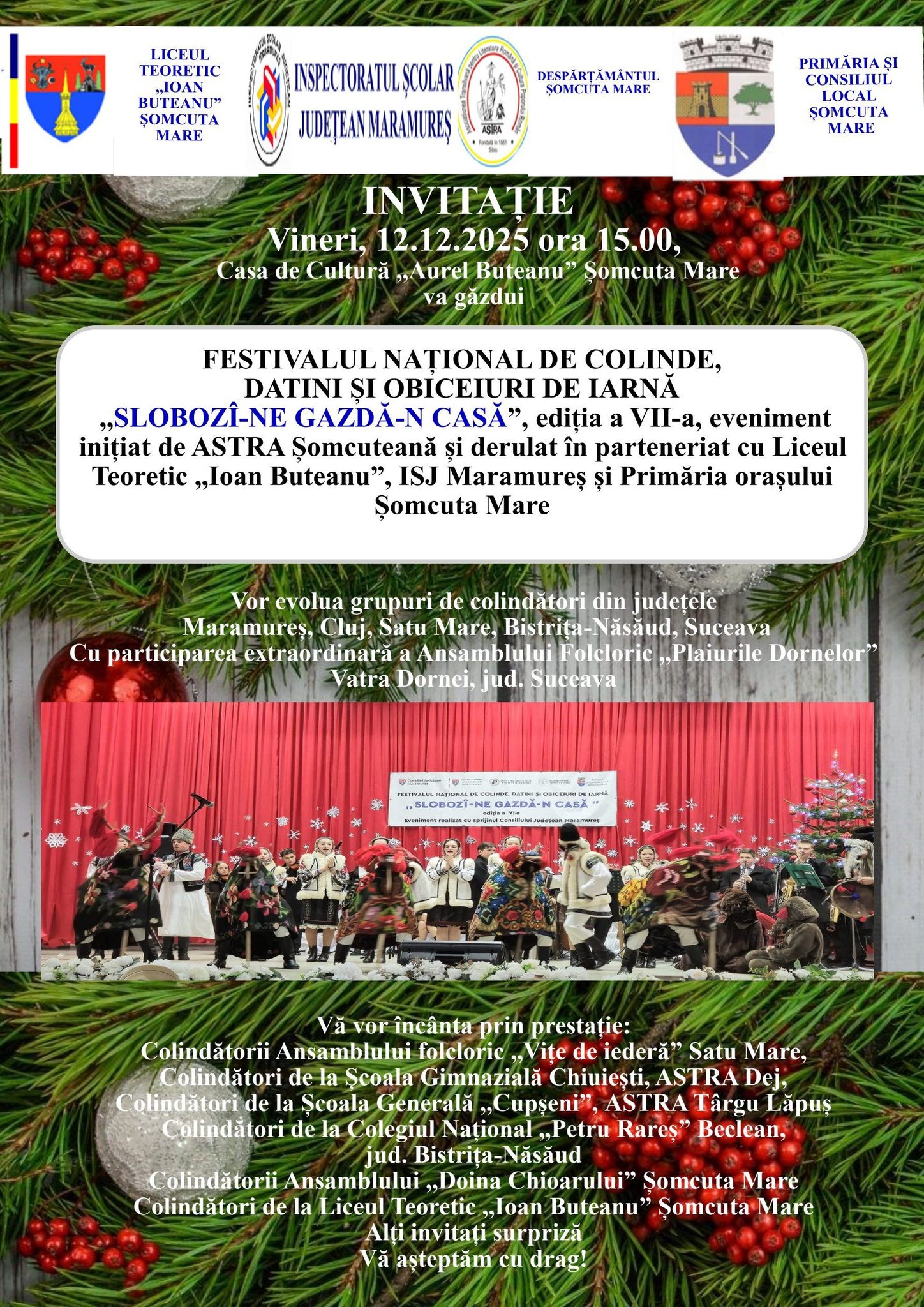 Atmosferă de sărbătoare la Șomcuta Mare azi, 12 decembrie, de la ora 15:00. Casa de Cultură „Aurel Buteanu” va găzdui cea de-a VII-a ediție a Festivalului Național de Colinde, Datini și Obiceiuri de Iarnă „Slobozî-ne gazdă-n casă”.