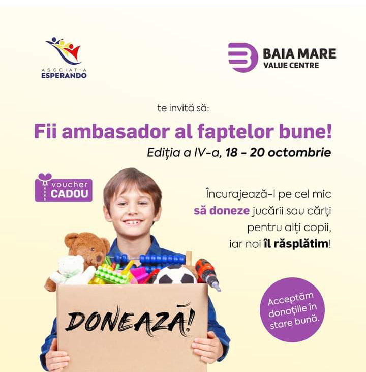 În perioada 18-20 octombrie 2024, va avea loc evenimentul caritabil „Fii ambasador al faptelor bune”, organizat de Value Centre Baia Mare și Asociația „Esperando”. Sunt invitați în număr cât mai mare, toți cei care vor să doneze cărți și jucării pentru copiii nevoiași. Organizatorii îi vor răsplăti pe donatori cu câte o diplomă „Fii ambasador al faptelor bune” și un voucher valoric, care va putea fi folosit la comercianții selectați din zona Food Court a Value Centre.