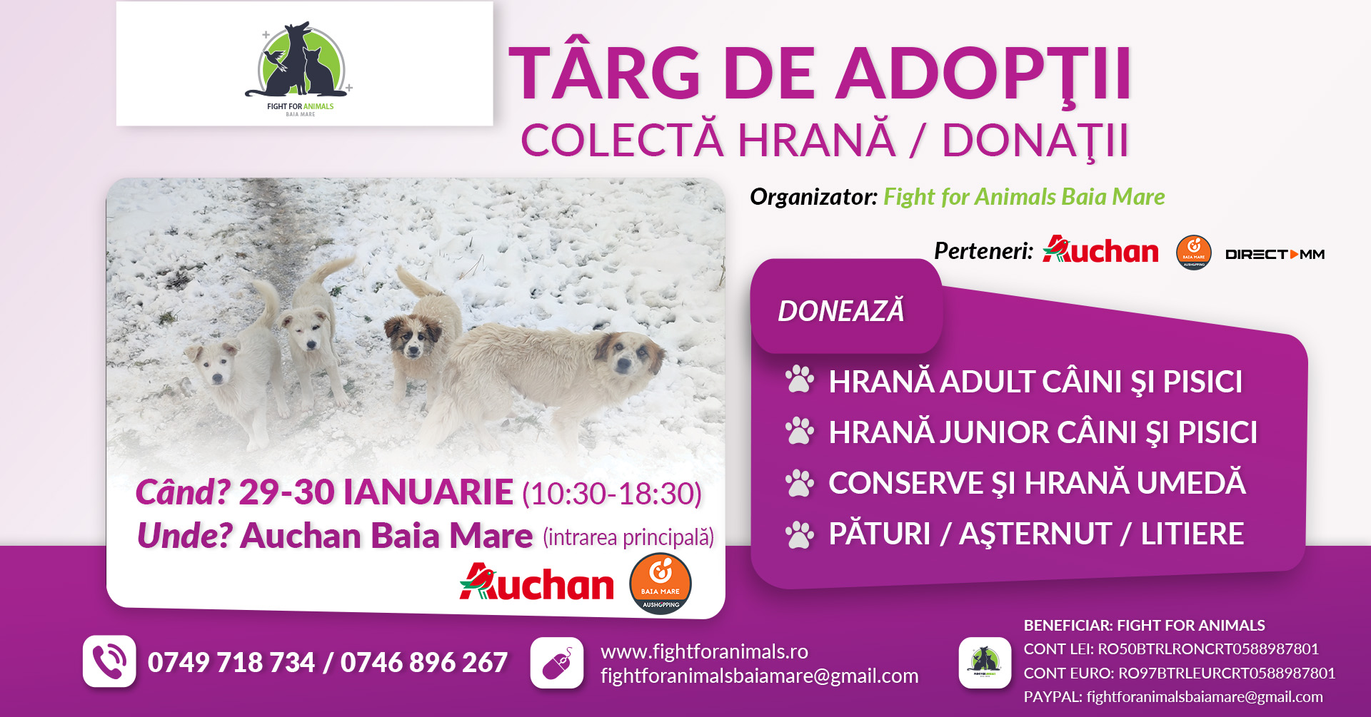 Asociatia Fight for Animals Baia Mare organizează târg de adopţii, colectă de hrană şi cele necesare pentru animale. Toate donaţiile vor merge către animalele din adapostul public Baia Mare, adaposturi private si cazuri sociale.