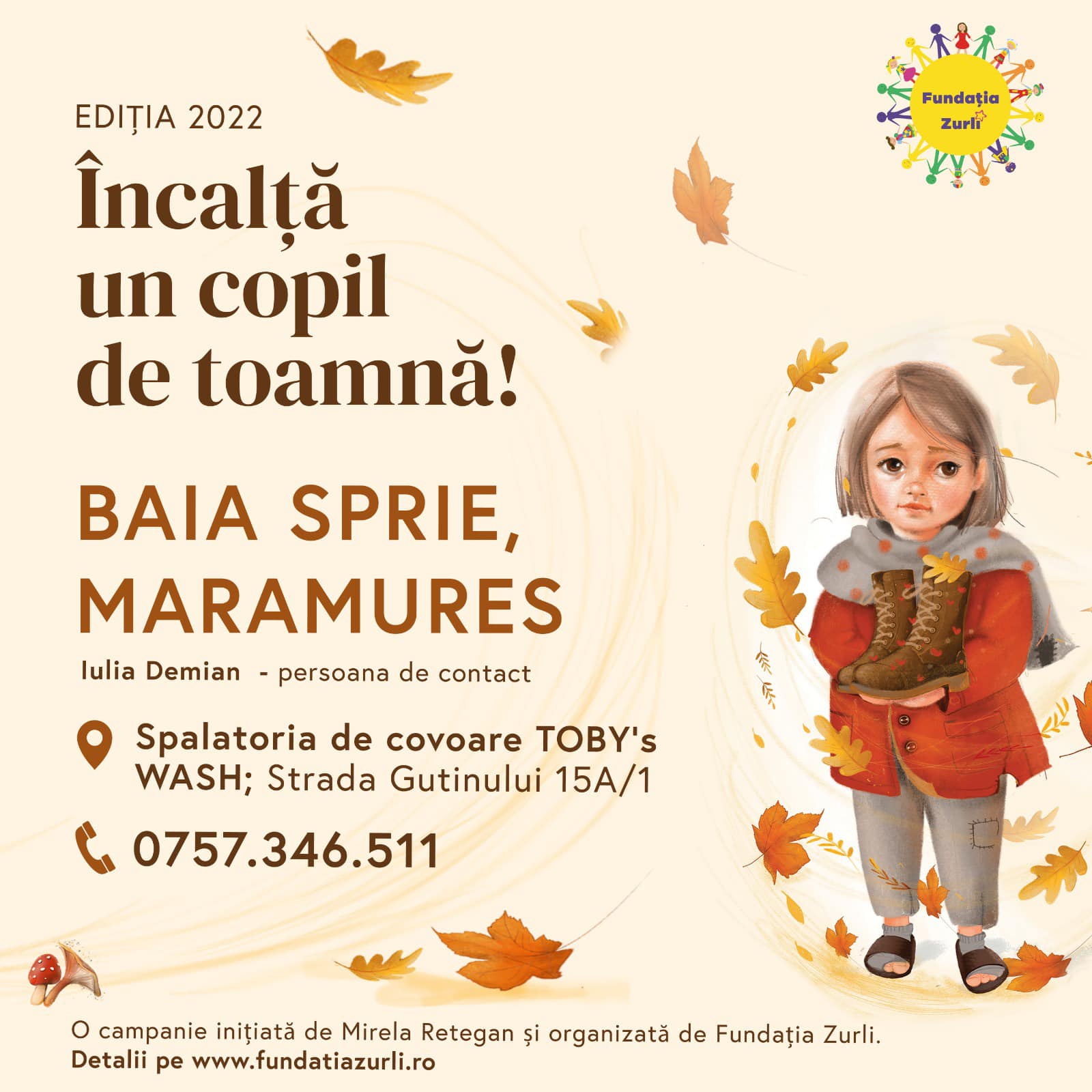 În primele trei ediții, Încalță un copil a mobilizat mii de oameni din țară și comunitățile de români din diaspora. Astfel, organizatorii, cu ajutorul partenerilor lor, au reușit să strângă 25.000 de perechi de încălțări noi, pentru 25.000 de copii din toată România. Fundația Zurli este una dintre cele mai active ONG-uri la nivel național, cu zeci de proiecte derulate în beneficiul copiilor și familiilor aflate în dificultate, al copiilor bolnavi de cancer sau al mamelor vulnerabile. Mirela Retegan, în calitate de președinte al fundației, a dezvoltat continuu rețeaua de asociații partenere, pentru a atinge un număr cât mai mare de beneficiari finali, dar mai ales pentru a implanta în mentalul colectiv ideea de a face bine împreună. Persoanele fizice sau juridice care doresc să susțină campania financiar o pot face folosind datele următoare : Benficiar: Fundația Zurli, Cont LEI RO70INGB0000999906701090, Cont EURO RO67INGB0000999910896976, ING BANK, Banca: ING Bank, Detalii tranzacție: campanie “ Încalță un copil, de toamnă” 2022. Aveți atașate informațiile pentru orașul Baia Sprie, care s-a raliat campaniei.