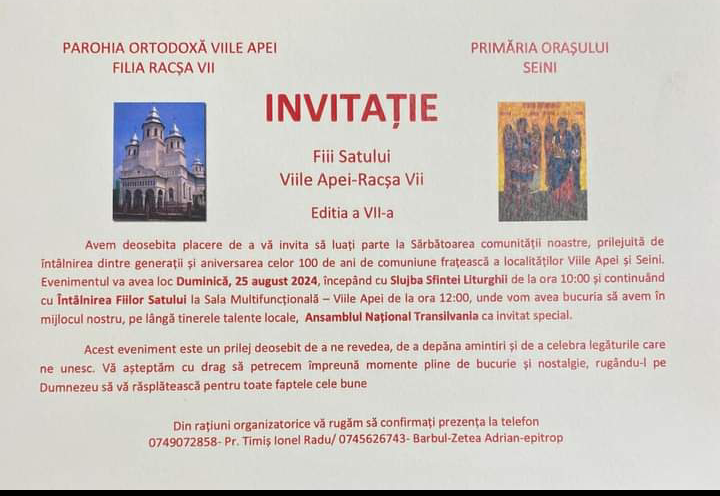 Parohia Ortodoxă Viile Apei Rașca Vii împreună cu Primăria orașului Seini organizează duminică, 25 august 2024, Sărbătoarea comunității prilejuită de întâlnirea dintre generații și aniversarea celor 100 de ani de comuniune frățească a localităților Viile Apei și Seini.