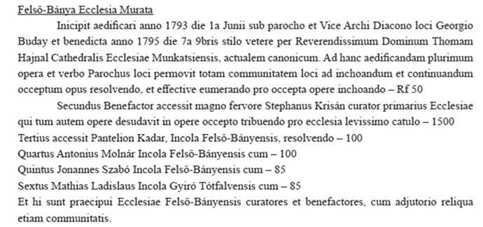 Nu specifică dacă a contribuit și el cu bani sau s-a implicat doar administrativ. Evidențiază în mod deosebit acele persoane care au contribuit cu o sumă mai mare la lucrare, și anume: „Al doilea binefăcător a fost prim curatorul parohiei, Crișan Ștefan – 1500 de florini. Al treilea binefăcător, Pantelimon Kadar din Baia Sprie – 100 florini. Al patrulea binefăcător din Baia Sprie, Anton Molnar – 100 florini. Al cincilea binefăcător din Baia Sprie, Ioan Szabo – 85 florini. Al șaselea binefăcător, Matias sau Mariaș Ladislau din Tăuții de Sus – 85 florini.