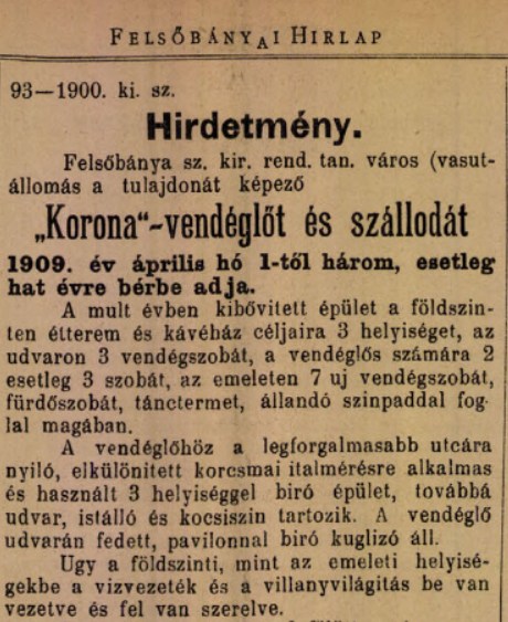 Anunțul este tipărit în limba maghiară sub semnătura primarului de atunci Farkas Jenő și a notarului Moldovan Ferenc: „De la 1 aprilie 1909, se închiriază restaurantul și hotelul „Korona” pentru trei sau șase ani. Clădirea, care a fost extinsă anul trecut, include 3 camere la parter cu destinație de restaurant și cafenea, 3 camere de oaspeți în curte, 2 sau 3 camere pentru administrator, și 7 camere de oaspeți noi, o baie, o sală de dans cu scenă permanentă la etaj”.