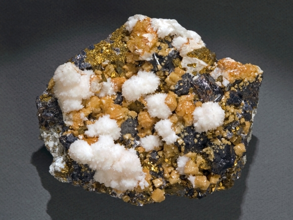 Calcitul (CaCO₃) – este unul dintre cele mai răspândite minerale din domeniul sedimentar și filoanele hidrotermale. Piesa din imagine conține agregate semisferice de calcit alb, cristale romboedrice maronii de siderit, calcopirită galbenă cu luciu metalic și cristale negre lucioase de blendă, reunite într-un eșantion cu o estetică deosebită. Carbonatul de calciu reprezintă materia primă pentru producerea varului și cimentului, este folosit în construcţii, în industria chimică, a sticlei şi a oţelului. Cristalele pure și transparente se utilizează în industria optică, au explicat reprezentanții unității muzeale băimărene.