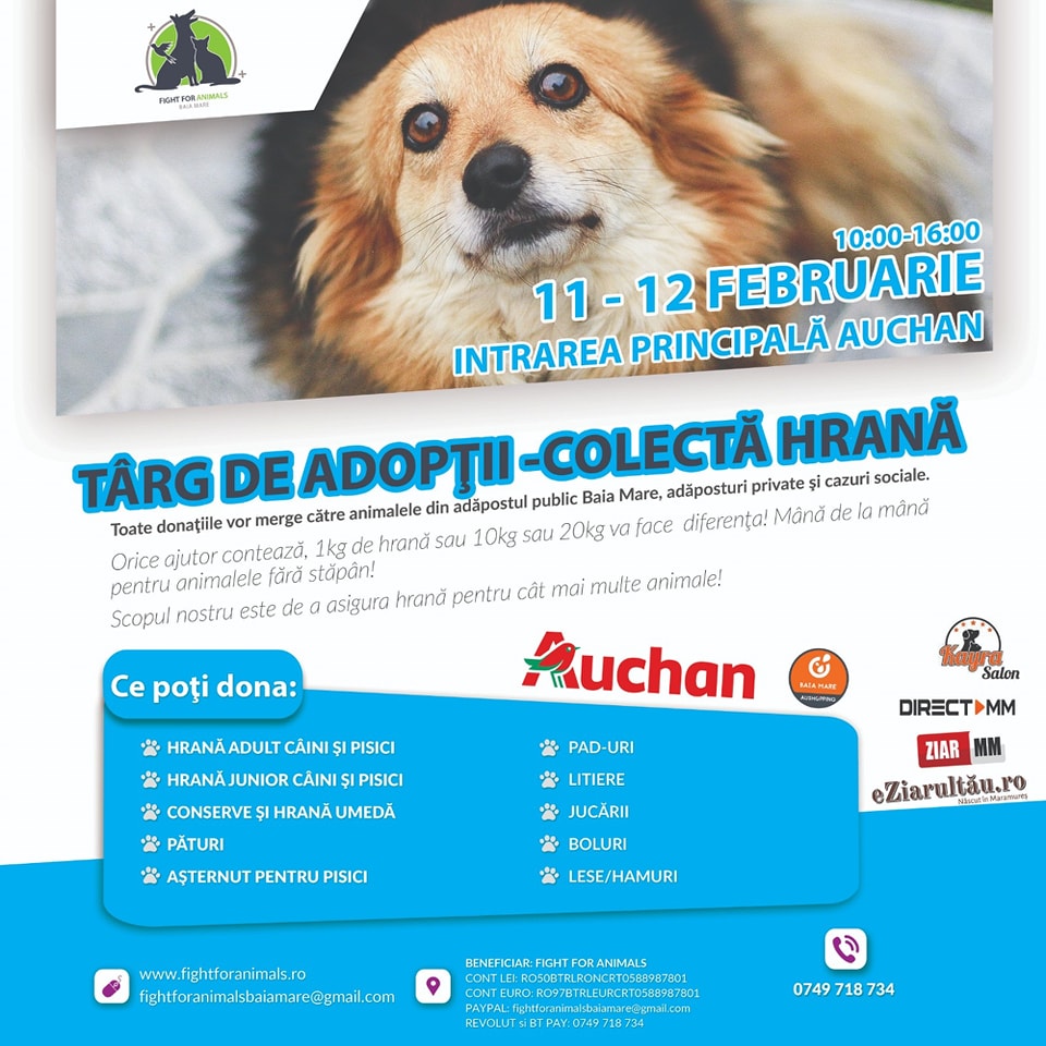 Primul târg de adopții și colectă hrană din anul 2023, ediția numărul 7 organizator fiind Asociația Fight for Animals Baia Mare, are loc în weekendul 11-12 februarie.