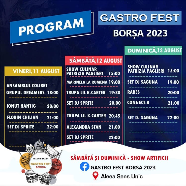 „Petrecem trei zile cu muzică bună, mâncare excelentă, prieteni buni și artificii! 11-13 august, la Borșa, pe Aleea Sens Unic – Gastro Fest 2023!