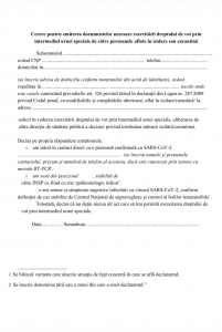 Președintele BESV asigură în ziua de 5 decembrie 2020, între orele 18.00 și 20.00, permanența la sediul secției de votare, pentru a putea primi cererile de votare prin intermediul urnei speciale ale alegătorilor. Pot vota prin intermediul urnei speciale: 1) Alegătorii care nu se pot deplasa la sediul secției de votare din cauză de boală sau invaliditate, dacă au domiciliul sau reședința în circumscripția electorală în care se află secția de votare Cererea de vot prin intermediul urnei speciale: − se depune la secția de votare cea mai apropiată de imobilul unde se solicită deplasarea echipei care însoțește urna specială, cel mai târziu în preziua votării – 5 decembrie 2020, între orele 18.00 și 20.00. Cererile de vot (vezi modelul de cerere a urnei speciale la finalul materialului) prin intermediul urnei speciale, depuse la biroul electoral de circumscripție sau la oficiul electoral, vor fi transmise prin grija acestuia, prin orice mijloace, biroului electoral al secției de votare celei mai apropiate de imobilul la care s-a solicitat deplasarea urnei speciale; − poate fi depusă prin intermediul oricărei persoane; − trebuie să fie datată și semnată olograf de către alegătorul care solicită urna specială; − cuprinde, în mod obligatoriu: numele, prenumele, codul numeric personal, domiciliul sau reședința, conform mențiunilor din actul de identitate ori dovada de reședință, după caz, adresa imobilului unde se solicită deplasarea echipei BESV, seria și numărul actului de identitate, precum şi numărul de telefon; − trebuie să fie însoțită de copii ale oricărui act din care rezultă boala, starea de sănătate ori de invaliditate; din conținutul înscrisurilor primite trebuie să se poată stabili lipsa posibilității alegătorului de a se autodeplasa la sediul secției de votare, nefiind necesar ca acestea să cuprindă în mod expres sintagma „persoană netransportabilă”. Vor putea vota prin intermediul urnei speciale cetățenii cu drept de vot internați în unități sanitare publice sau private, persoanele deținute în baza unui mandat de arestare preventivă, persoanele reținute și persoanele care execută o pedeapsă privativă de libertate, dar care nu și-au pierdut drepturile electorale. Conform deciziei nr. 40/2020 a Biroului Electoral Central, alegătorul cu drept de vot aflat în carantină sau în izolare la domiciliu din cauza COVID, în locaţia declarată ori într-un spaţiu special desemnat de către autorităţile competente, poate vota la alegerile parlamentare din 6 decembrie a.c., prin intermediul urnei speciale. Dacă este în carantină, alegătorul trebuie să depună o cerere pentru urna specială însoțită de copia deciziei de carantină emisă de Direcţia de Sănătate Publică Maramureș.Alegătorul cu drept de vot se aflat în izolare la domiciliu, în locaţia declarată ori într-un spaţiu special desemnat de către autorităţile competente, poate vota prin intermediul urnei speciale dacă depune o cerere în acest sens şi copia unuia dintre următoarele documente: biletul de externare din unitatea sanitară care confirmă diagnosticul şi indicaţia de izolare; decizia de izolare emisă de Direcţia de Sănătate Publică Maramureș; rezultatul testării COVID-19 RT-PCR (pozitiv) din ultimele 14 zile. Cetăţenii cu drept de vot aflaţi în aceste situaţii, cărora NU li s-au eliberat actele în cauză, pot transmite, prin orice mijloace, birourilor electorale de circumscripţie sau oficiilor electorale, după caz, cereri privind emiterea documentelor necesare exercitării votului prin intermediul urnei speciale. Birourile electorale de circumscripţie şi oficiile electorale asigură transmiterea, de îndată, către direcţiile de sănătate publică judeţeeană a listei persoanelor care au transmis cereri, în vederea luării măsurilor necesare pentru emiterea urgentă a documentelor necesare exercitării dreptului de vot prin intermediul urnei speciale.
