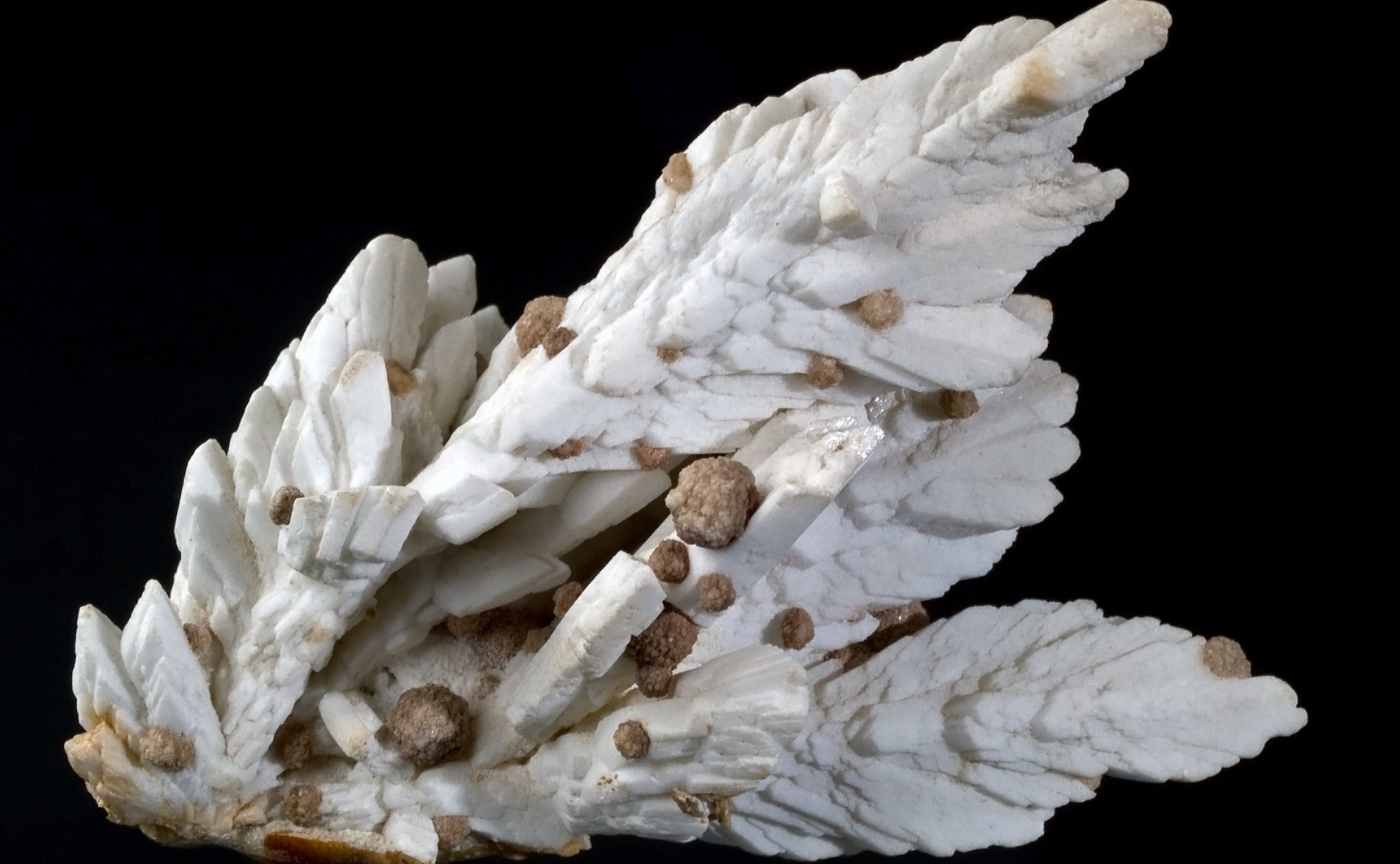 Este vorba despre Gips (CaSO₄), Calcit (CaCO₃) – eșantion format din cristale tabulare scurte de gips alb mat, dispuse sub forma unor concreșteri piramidale de maxim 100 mm. Pe suprafața eșantionului se observă depuse câteva formațiuni sferice formate din cristale de calcit galben maroniu.