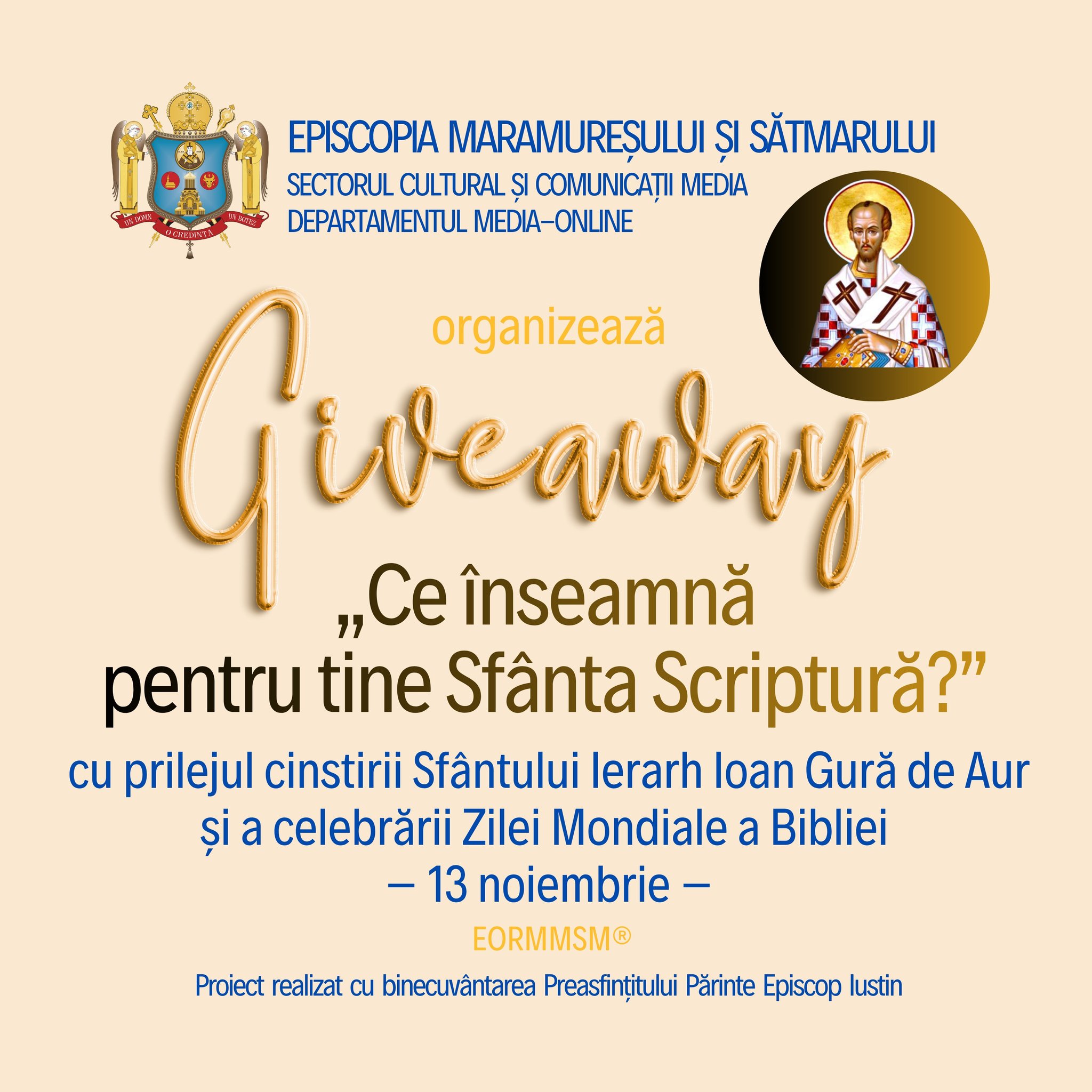 Cu binecuvântarea Preasfințitului Părinte Iustin, Episcopul Maramureşului și Sătmarului, Departamentul Comunicații Media-Online din cadrul Sectorului Cultural și Comunicații Media organizează un Giveaway pe Instagram prilejuit de ziua cinstirii Sfântului Ierarh Ioan Gură de Aur și Ziua Bibliei (13 noiembrie).