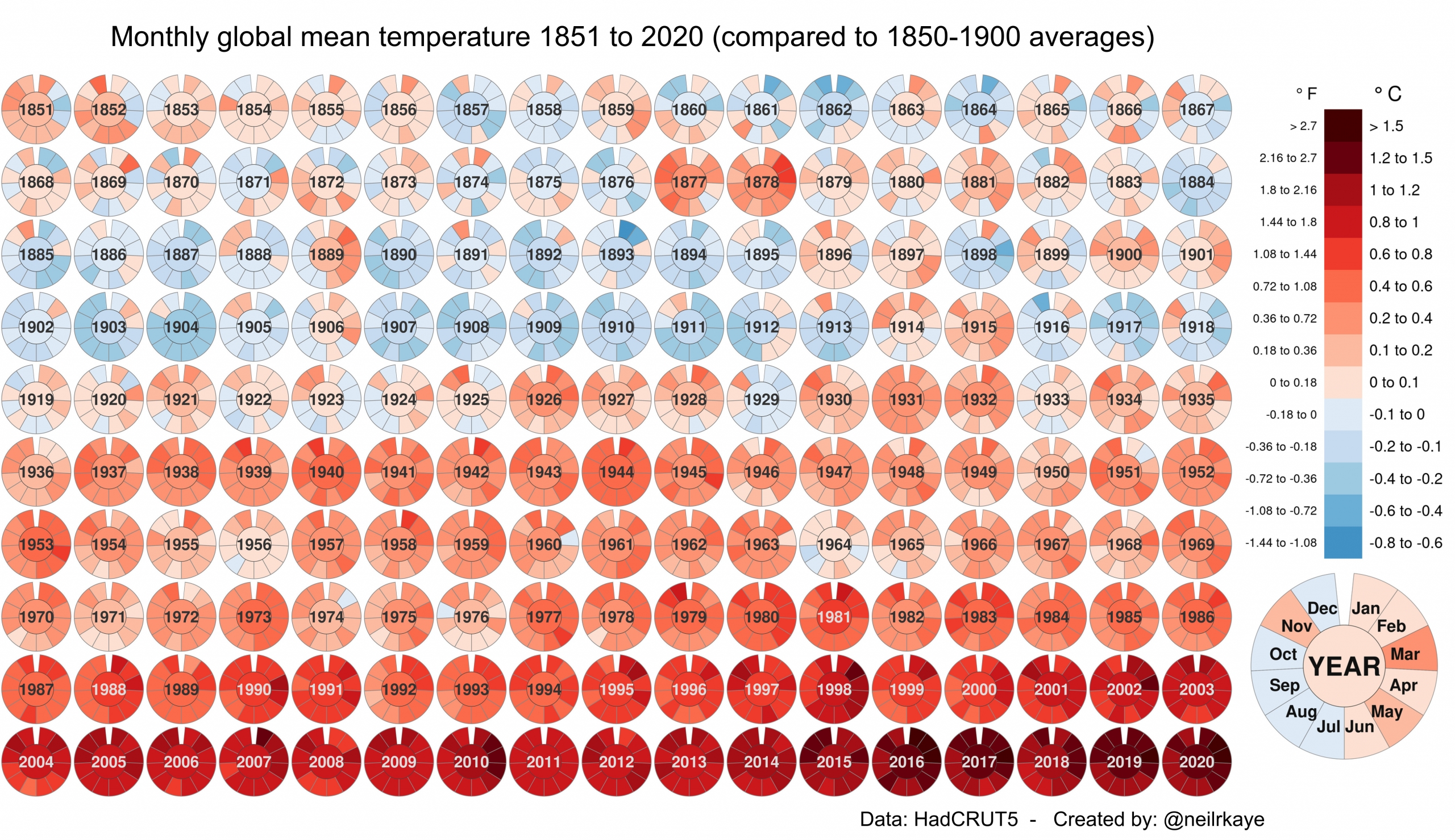 Graficul, care poate fi deschis la rezoluție mare aici, în material, însă îl puteți vizualiza în subsolul textului, a fost realizat de Neil R. Kaye, om de știință specializat în date climatice, care a comparat temperaturile medii lunare globale la suprafața Pământului din 1851 până în 2020 cu media temperaturilor medii lunare din perioada preindustrială 1850-1900.