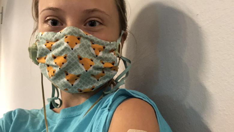 Activista suedeză pentru mediu în vârstă de 18 ani a distribuit pe Twitter o fotografie în care poartă o masca cu imprimeu de vulpe, cu un plasture pe braţ, în locul în care s-a vaccinat.