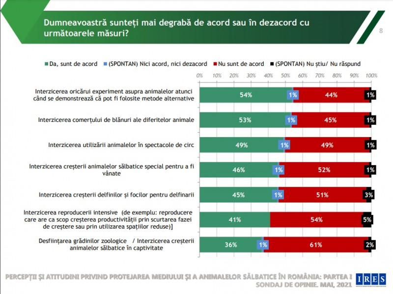 Mai mult de jumătate dintre români (52%) spun că nu ar fi de acord cu interzicerea creșterii animalelor sălbatice special pentru a fi vânate. 51% nu sunt de acord să se interzică creșterea focilor și delfinilor pentru delfinarii, măsură care ar fi susținută de 45% dintre respondenți. Cât privește interzicerea folosirii animalelor în spectacolele de circ, deși România a adoptat în 2017 legea care interzice folosirea animalelor sălbatice în spectacolele de circ, părerile sunt împărțite: 49% sunt de acord, iar 49% sunt împotriva acestei măsuri. 53% sunt de acord cu interzicerea comerțului cu blănuri ale diferitelor animale, iar 45% sunt împotrivă. Un român din doi (54%) se declară favorabili interzicerii oricărui experiment asupra animalelor atunci când se demonstrează că pot fi folosite metode alternative. Aproape 8 din 10 români au auzit despre cazul mediatizat în ultima perioadă privind un urs din România împușcat de un membru al monarhiei din Liechtenstein, în cadrul unei partide de vânătoare care ar fi avut loc în luna martie a acestui an. Mai informați cu privire la acest caz sunt bărbații decât femeile, iar gradul de informare crește proporțional cu vârsta și cu nivelul de educație.