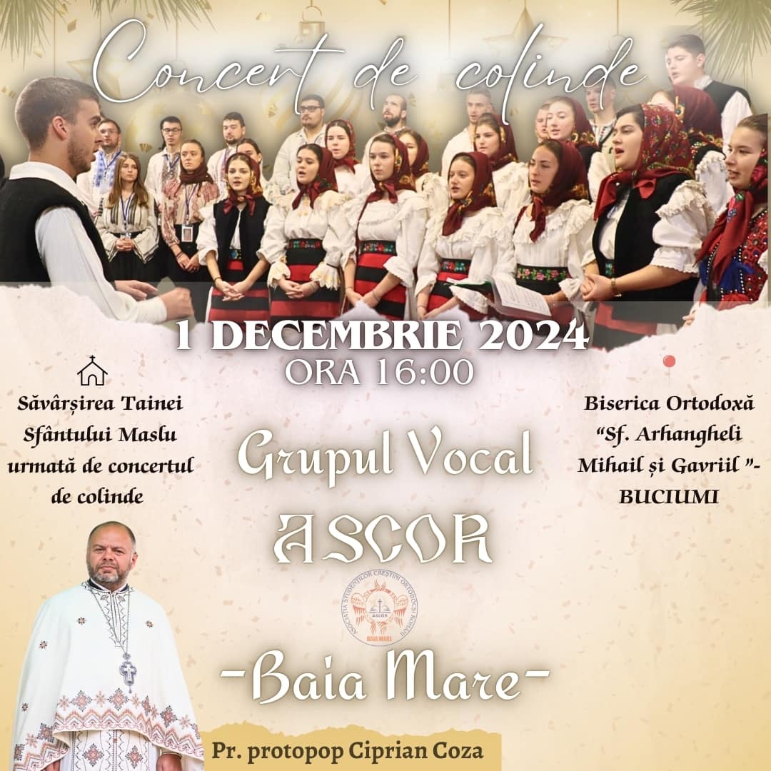 „Cu binecuvântarea Preasfințitului Părinte Iustin, Episcopul Maramureșului și Sătmarului, vă așteptăm cu mult drag duminică, 1 decembrie, la ora 16:00, la Biserica Ortodoxă “Sf. Arhangheli Mihail și Gavriil” din Buciumi, unde vom săvârși Taina Sfântului Maslu în sobor de 7 preoți, urmată de un concert de colinde susținut de Grupul Vocal ASCOR Baia Mare”, transmite pr. protopop Ciprian Coza.