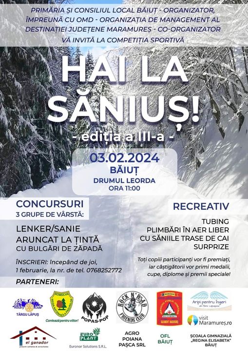 Primăria și Consiliul Local Băiuț împreună cu Organziația de Management al Destinației Județene (OMD Maramureș organizează competiția sportivă „Hai la săniuș!” Evenimentul va avea loc pe data de 3 februarie, la Băiuț, de la ora 11.00.