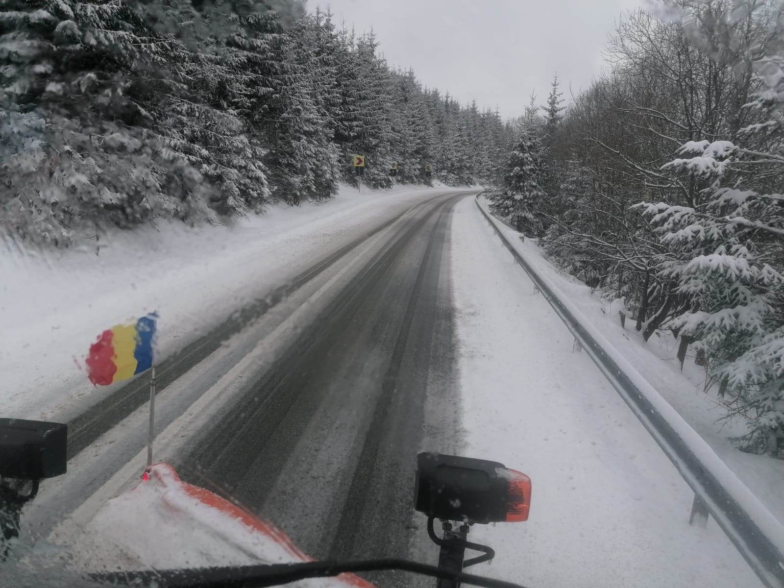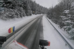 DN18 – Pasul Prislop, carosabil acoperit cu un strat de zapada framantata care masoara pana la 1 cm. S-a actionat cu cinci utilaje si s-au raspandit 17 tone de material antiderapoant. Cer acoperit, ninge pe drumul national. Vantul prezinta intensificari temporare cu viteze de pana la 30 km/h. Vizibilitatea in trafic este buna.