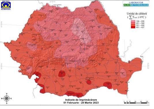 Dar cum stăm cu împrimăvărarea! Există un indice care măsoară acest lucru, arată oficialii ANM. Indicele de împrimăvărare reprezintă potențialul termic al perioadei de trecere de la anotimpul de iarnă la primăvară pentru culturile agricole aflate în vegetație, care însumează temperaturile medii pozitive ale aerului (calculat în așa-numitele „unități de căldură”), de la 1 februarie până la mijlocul lunii aprilie, de regulă în prima decadă a lunii aprilie. La încheierea perioadei de vernalizare sau iernare, pentru reintrarea în vegetație a culturilor agricole este necesar un cuantum de temperaturi medii pozitive care să determine reluarea proceselor de creștere și dezvoltare, arată ANM. La această dată, 29 martie 2023, adică după acest episod de iarnă, se înregistrează împrimăvărare târzie (156-200 „unități de căldură”) se înregistrează local în estul Transilvaniei. Împrimăvărare moderată (201-300 „unități de căldură”) se înregistrează pe suprafețe agricole extinse din Transilvania, Maramureș, local Moldova, Muntenia, Dobrogea, Banat, Crișana. Împrimăvărare normală (301-400 „unități de căldură”) avem în cea mai mare parte a țării, cât despre Maramureș vorbim despre local sud-vestul regiunii. Împrimăvărare timpurie (401-427 „unități de căldură”) se înregistrează local în Oltenia și Muntenia.