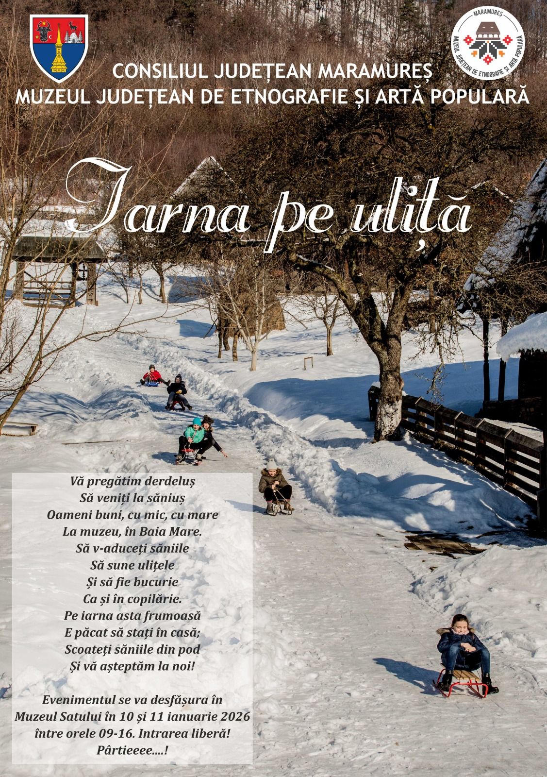 Muzeul Județean de Etnografie și Artă Populară Maramureș invită publicul la evenimentul „Iarna pe uliță”, care va avea loc în zilele de 10 și 11 ianuarie, la Muzeul Satului din Baia Mare, între orele 09:00 și 16:00.