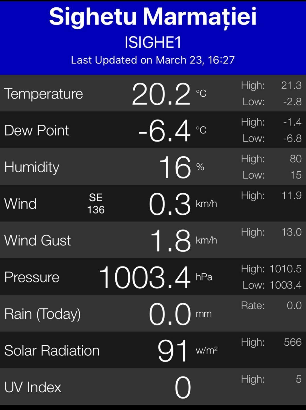 „Săptămâna trecută, joi, am trimis încă o dată anunțul cu proiectul nostru și am fost plăcut surprinși de rezultate. Am primit pe loc o donație consistentă, așa că vineri am și dat comanda de prima stație meteo automată. Aceasta a ajuns la noi ieri și a și fost instalată și conectată. Mai sunt mici detalii de reglat, dar stația e funcțională în rețeaua Wunderground.com. Linkul stației este: https://www.wunderground.com/dashboard/pws/ISIGHE1. Puteți să salvați acest link sau puteți să instalați aplicația Wunderground și acolo să căutați și să adăugați la favorite stația cu codul ISIGHE1. Oricum, vă mulțumim pentru implicare și abia așteptăm să dăm drumul și celei de-a doua stații, cândva săptămânile viitoare”, arată acum Meteo Sighetu Marmației. Iată cum puteți accesa datele stației meteo automate din Sighet! Accesăm adresa stației: https://www.wunderground.com/dashboard/pws/ISIGHE1. La deschidere, temperaturile sunt afișate în grade Fahrenheit. Schimbăm în grade Celsius din meniul de setări, unde alegem °C. Acum avem datele afișate corect, în pagina stației având la dispoziție parametrii măsurați în timp real, dar și toată baza istorică de date din momentul instalării stației, cu analize și grafice. Un video ajutător este AICI!