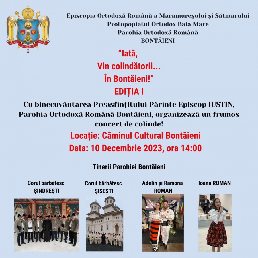 Vestea Nașterii Domnului o vor aduce tinerii Parohiei Bontăieni alături de Corurile bărbăteşti din Şindreşti şi Şişeşti, Adelin şi Ramona Roman, Ioana Roman.