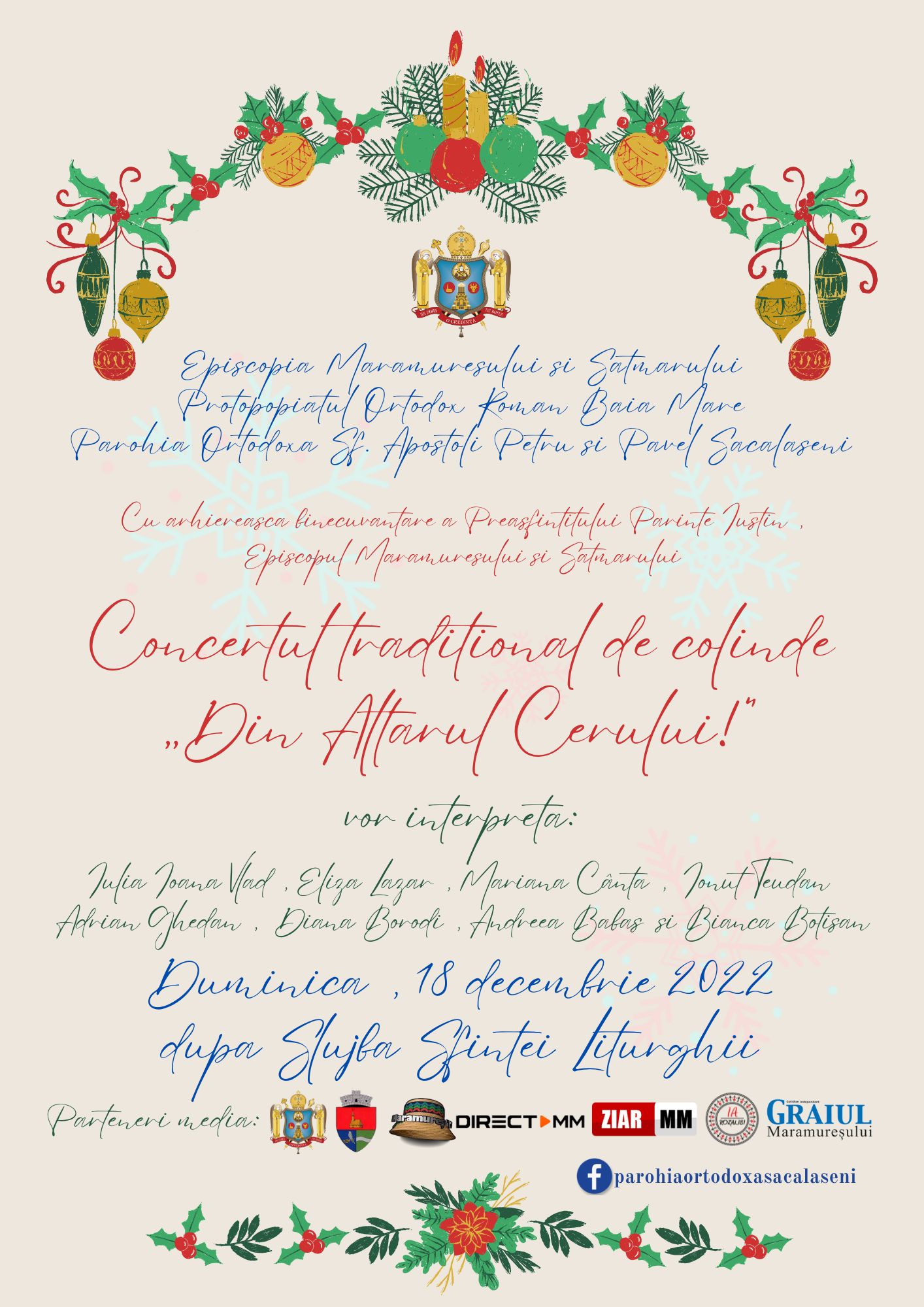Duminică, 18 decembrie, după Sfânta Liturghie, în Parohia Ortodoxă „Sfinții Apostoli Petru și Pavel” Săcălășeni va avea loc prima ediție a concertului de colinde „Din Altarul Cerului”.
