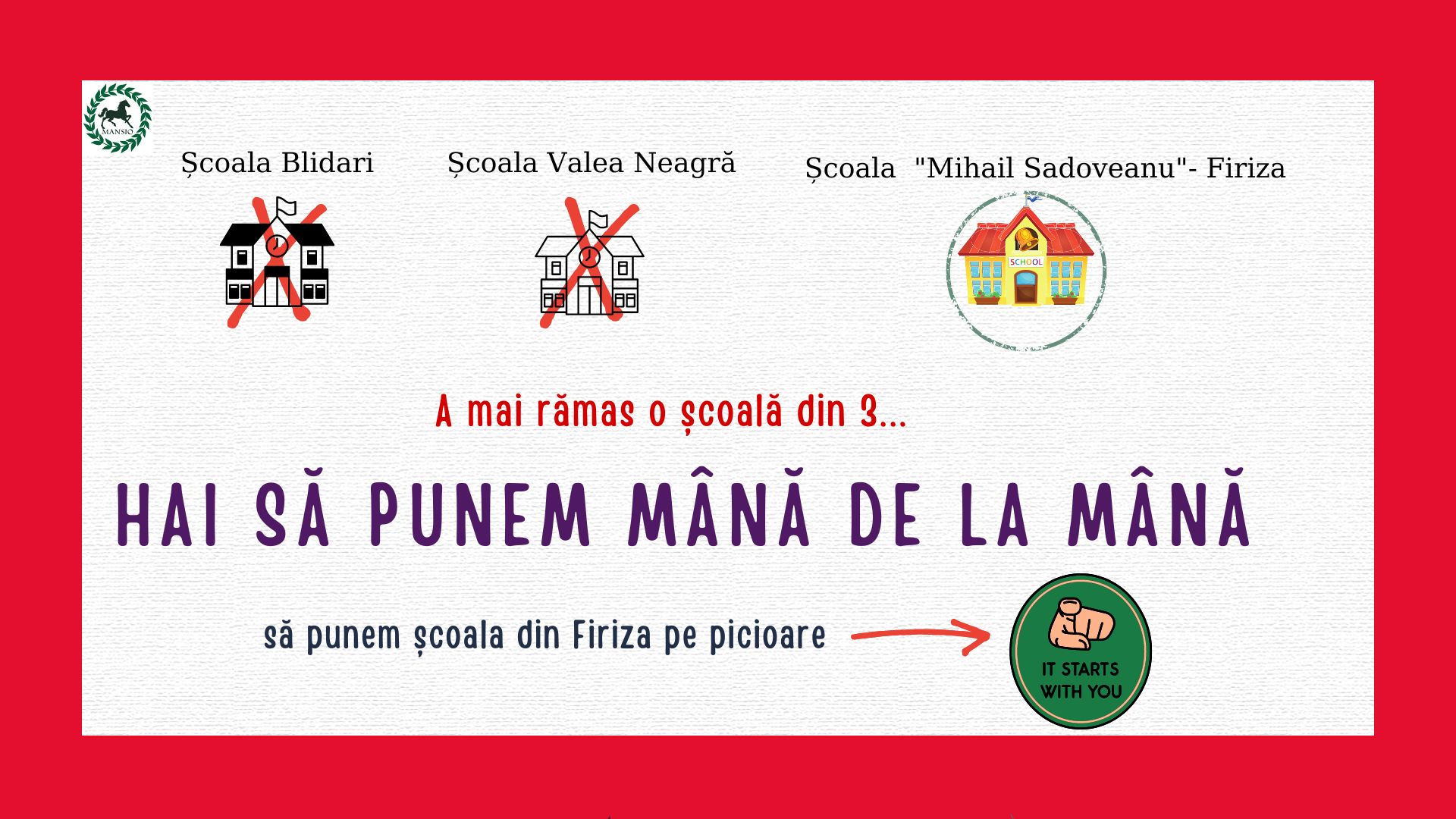 Hai sa punem mână de la mână și să contribuim fiecare cu ce putem – SĂ PUNEM ȘCOALA DIN FIRIZA PE PICIOARE!