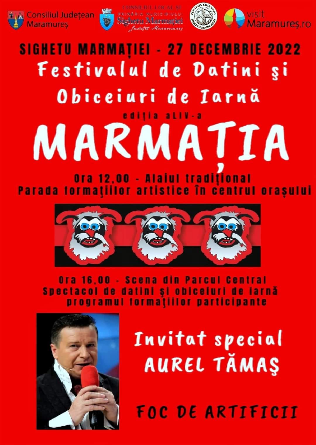 La Festivalul Marmația, cel mai longeviv eveniment de acest gen din România, isi dau întâlnire într-un spectacol tradițional de cântec și bucurie colindători din Țara Maramureșului și întreaga Românie. Obiceiurile, jocurile cu măști, colindele poartă în ele esența identității noastre maramureșene, a celei românești în general, identitate pe care avem obligația să o păstrăm și să o prețuim. Vă invit așadar, să ne bucurăm împreună de acest Unic moment, pe 27 Decembrie, la alaiul măștilor și portului popular și la spectacolul de gală ce vor avea loc în centrul orașului începând cu ora 12.00. Îndrăgitul interpret de muzică populară Aurel Tămaș, va încinge atmosfera cu un spectacol de excepție, iar seara o vom încheia cu focuri de artificii. Sperăm să aducem tuturor o rază de lumină, bucurie și speranță în aceste vremuri complicate. Vă așteptăm cu drag în inima Maramureșului Voievodal, la Sighetu Marmației!”, arată primarul Vasile Moldovan.