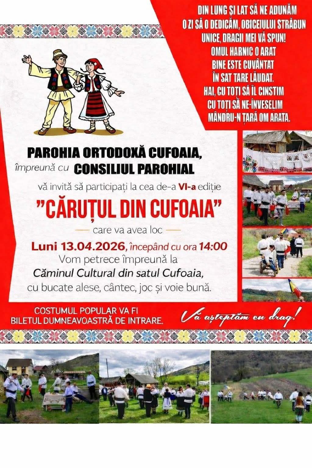 În a doua zi de Paște, 13 aprilie, când bucuria sărbătorii se împletește cu liniștea satului și cu dorul de tradiție, comunitatea din Cufoaia organizează cea de-a VI-a ediție unui eveniment de suflet: „Căruțul din Cufoaia”. Începând cu ora 14:00, satul prinde din nou viață într-un mod aparte, readucând în prezent farmecul și autenticitatea vremurilor de altădată.