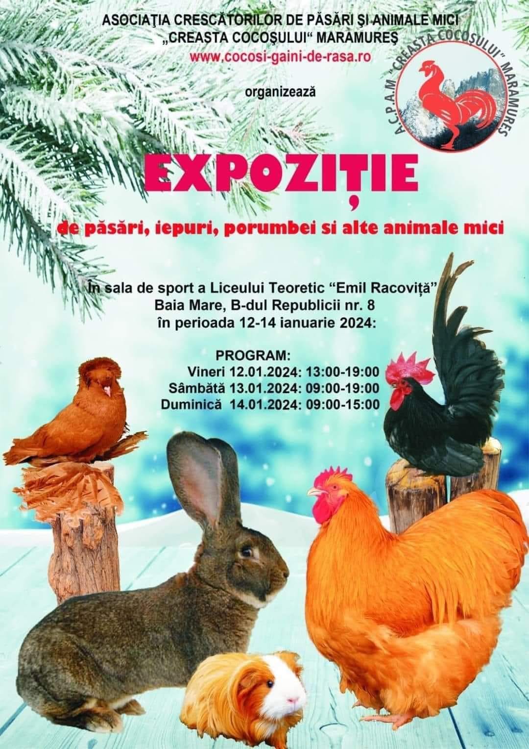 În acest weekend, în sala de sport a Liceului Teoretic „Emil Racoviță” Baia Mare va avea loc o expoziție de păsări, iepuri, porumbei și alte animale mici. Evenimentul este organizat de Asociația Crescătorilor de Păsări și Animale Mici “Creasta Cocoșului” Maramureș.