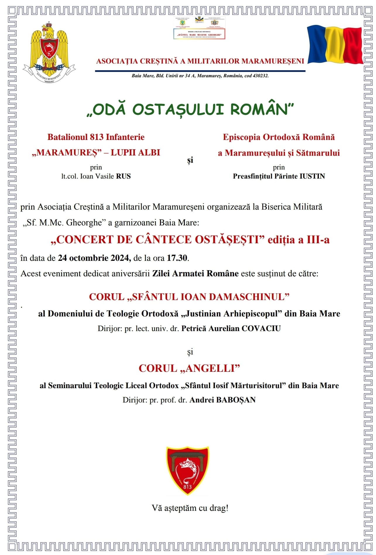 În 24 octombrie, de la ora 17.30, Biserica Militară „Sf. M.Mc. Gheorghe” Baia Mare găzduiește cea de-a III-a ediție a „Concertului de cântece ostășești”. Evenimentul este dedicat aniversării Zilei Armatei Române (25 octombrie).