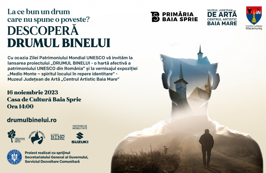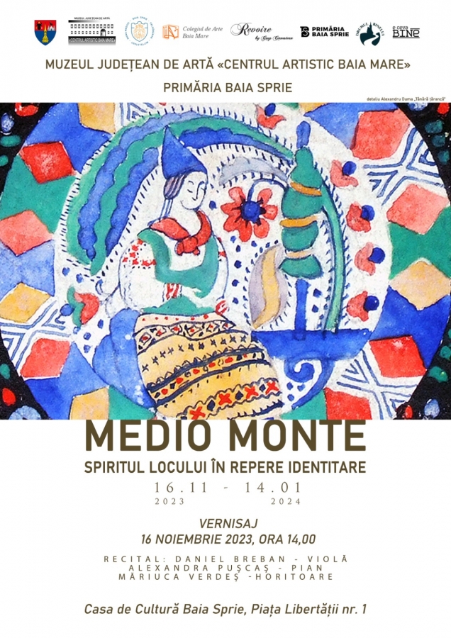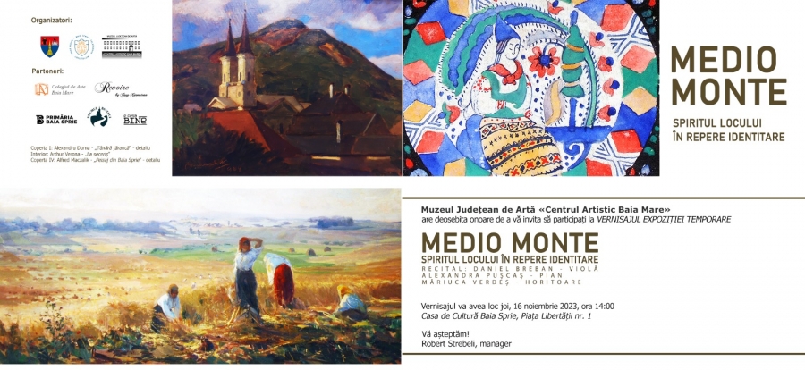 Joi, 16 noiembrie, începând cu ora 14:00, la sediul Casei de Cultură din Baia Sprie va avea loc vernisajul expoziției temporare «Medio Monte – spiritul locului în repere identitare», organizată de Muzeul Județean de Artă «Centrul Artistic Baia Mare» în colaborare cu Primăria Orașului Baia Sprie și Asociația „E Ceva Bine” – București.