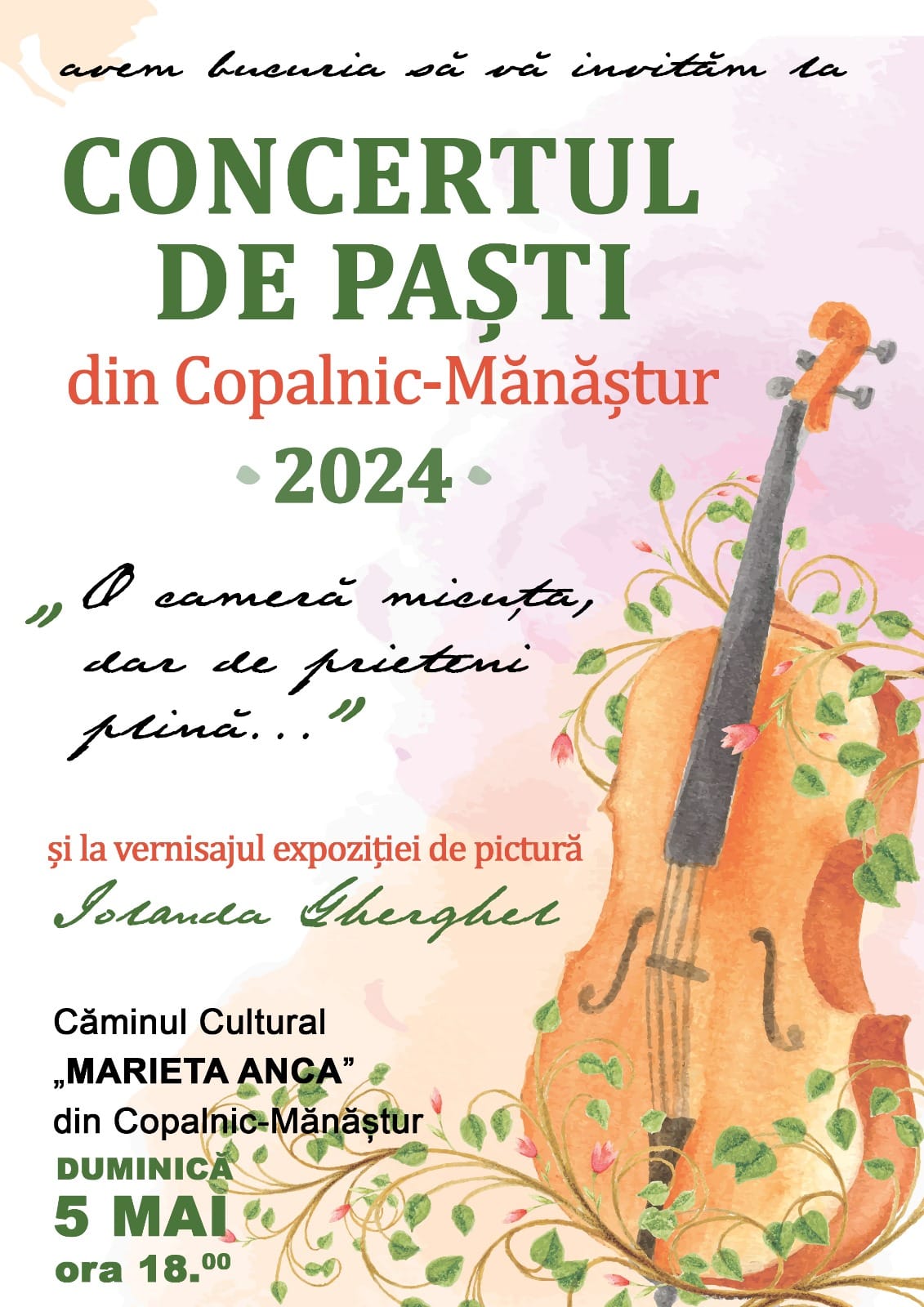 Duminică, 5 mai, de la ora 18.00, Căminul Cultural „Marieta Anca” din Copalnic Mănăștur va găzdui Concertul de Paști „O cameră micuță, dar de prieteni plină…”.