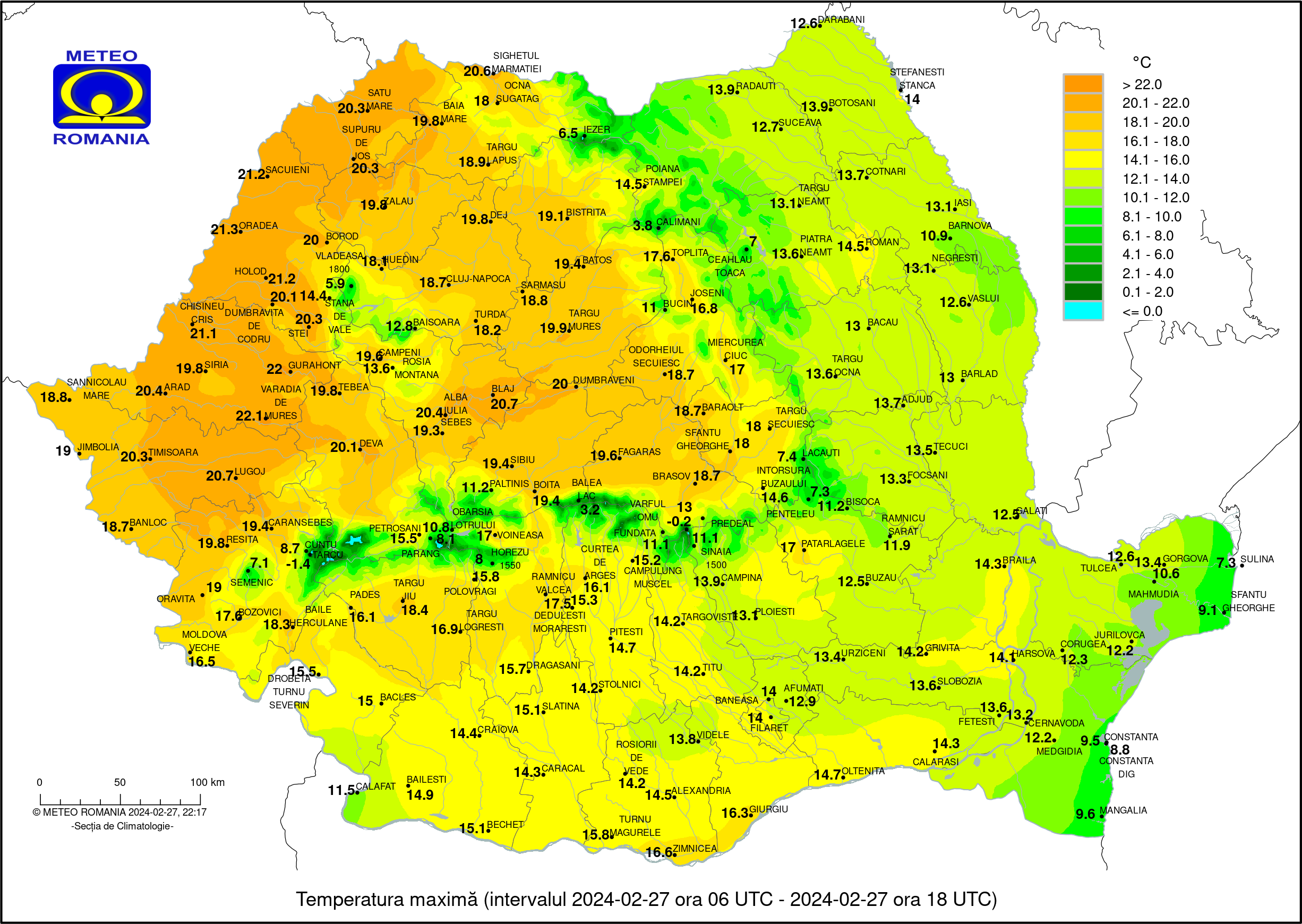 Până atunci, șefa Administrației Naționale de Meteorologie a oferit câteva explicații valabile la nivel național. ”Luna februarie 2024 este cea mai caldă luna februarie din istorie, pentru intervalul 1-27 februarie 2024 abaterea termică este de 6,7 grade. În februarie 2016 am avut o abatere de 5,7 grade! Ceea ce este de remarcat este faptul că este cea mai mare abatere termică, nu numai pentru luna februarie, cât și față de celelalte luni ale anului! Conform datelor prelucrate de ANM, în prezent, luna februarie 2024 este o lună deficitară din punct de vedere a precipitațiilor, cantitatea medie la nivel național fiind de 22.3 /mp, față de o normă de 31.6 l/mp, în condițiile în care luna februarie înregistrează cea mai mică cantitate medie multianuală din iarnă și chiar din întreg anul. Cu toate acestea, februarie 2024 nu este în top 5 – cele mai secetoase luni, cea mai secetoasă lună fiind februarie 1976, cu doar 9,7 l/mp. În februarie 2022 au căzut în medie 16,7 l/mp, iar în 2023, 40,7 l/mp”, arată Elena Mateescu, directorul ANM.