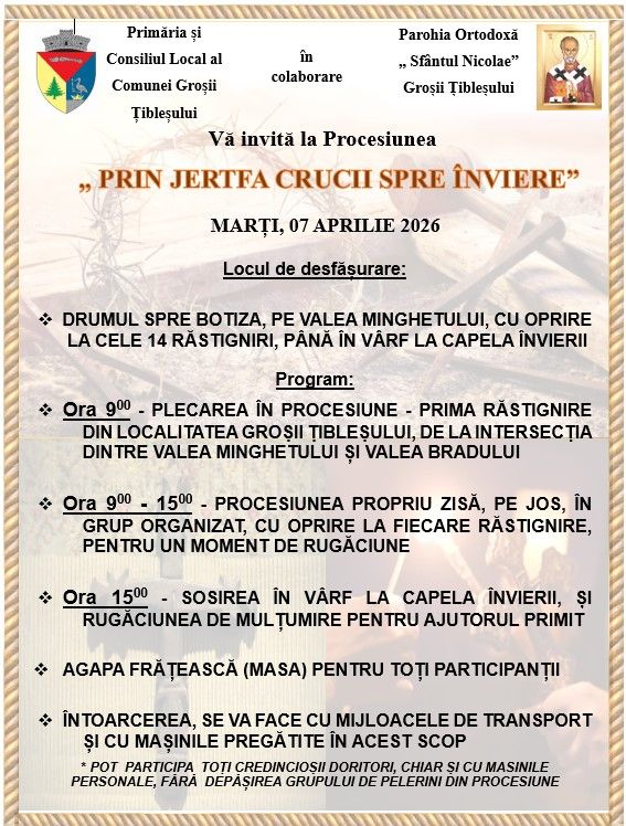 Mâine, 7 aprilie, a doua zi din Săptămâna Mare, în comuna Groșii Țibleșului va avea loc cea de-a doua ediție a procesiunii religioase „Prin Jertfa Crucii spre Înviere”, desfășurată pe drumul județean către Botiza.
