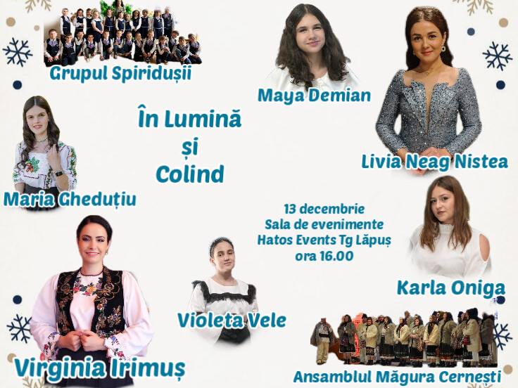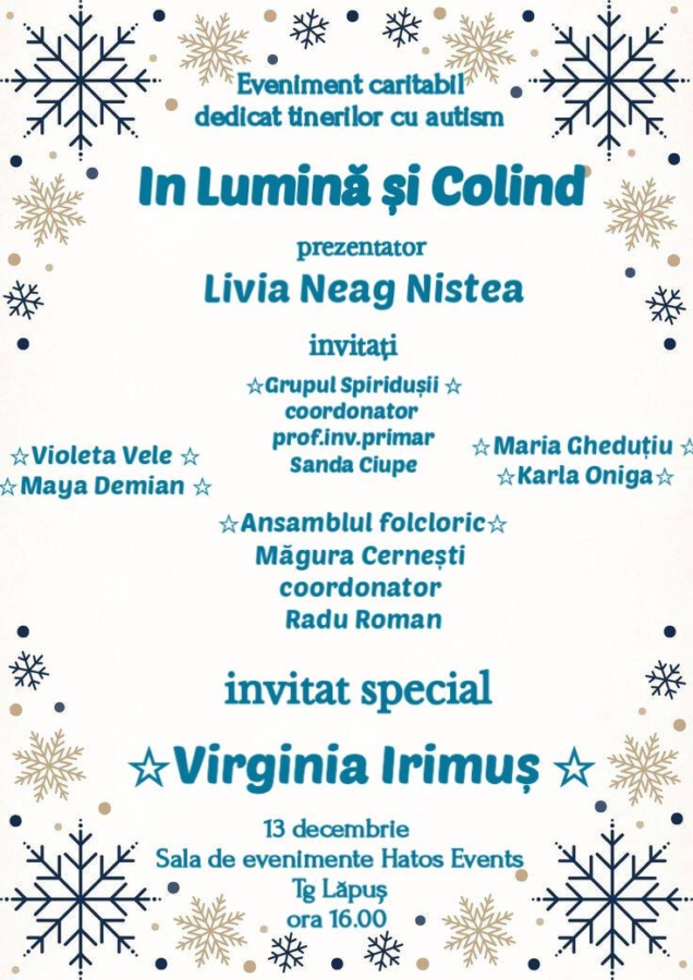 Sâmbătă, 13 decembrie de la ora 16:00, la Târgu Lăpuș va avea loc evenimentul caritabil „În Lumină și Colind”, organizat de Asociația Egal cu Tine la sala de evenimente Hatos Events.