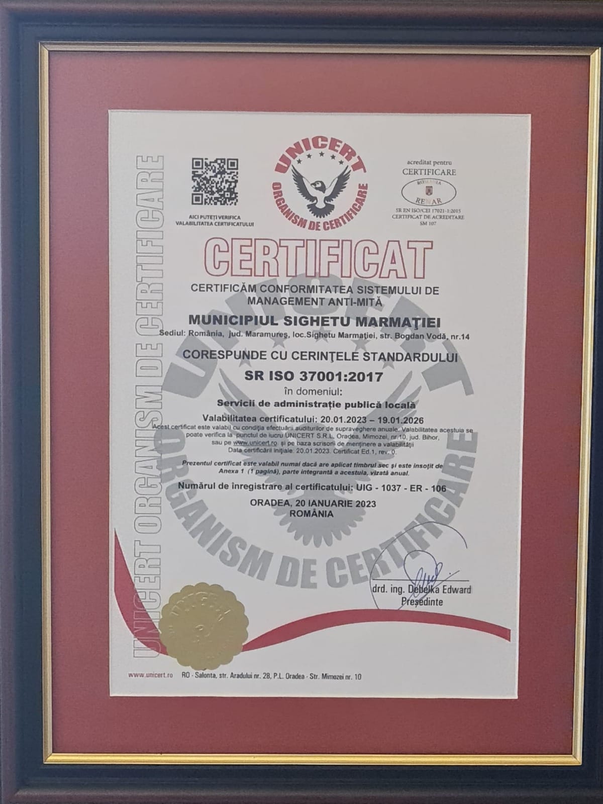 În urma desfășurării auditului de certificare, în perioada decembrie 2022 – ianuarie 2023, la nivelul primăriei s-a constatat că Sistemul de management anti-mită este implementat și există dovezile privind capacitatea sistemului de management de a îndeplini cerințele aplicabile și a atinge obiectivele așteptate. Astfel a fost emis Certificatul Sistemului Anti-Mită conform ISO 37001:2017 de către organismul de certificare, UNICERT SRL.