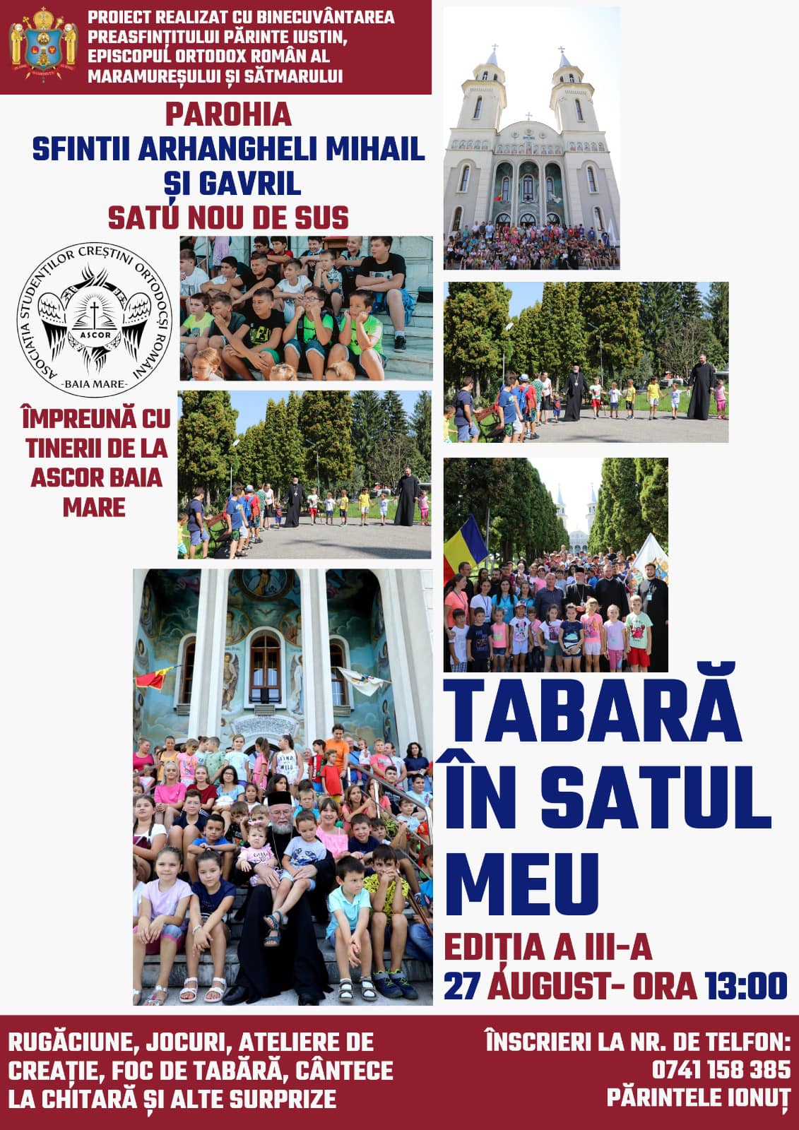 Cu binecuvântarea Preasfințitului Părinte Iustin, Episcopul Maramureșului și Sătmarului, în Parohia Ortodoxă „Sfinții Arhangheli Mihail și Gavriil” din localitatea Satu Nou de Sus, păstorită de părintele Ionuț Todorca, va avea loc o nouă ediție a evenimentului „Tabără în satul meu”.