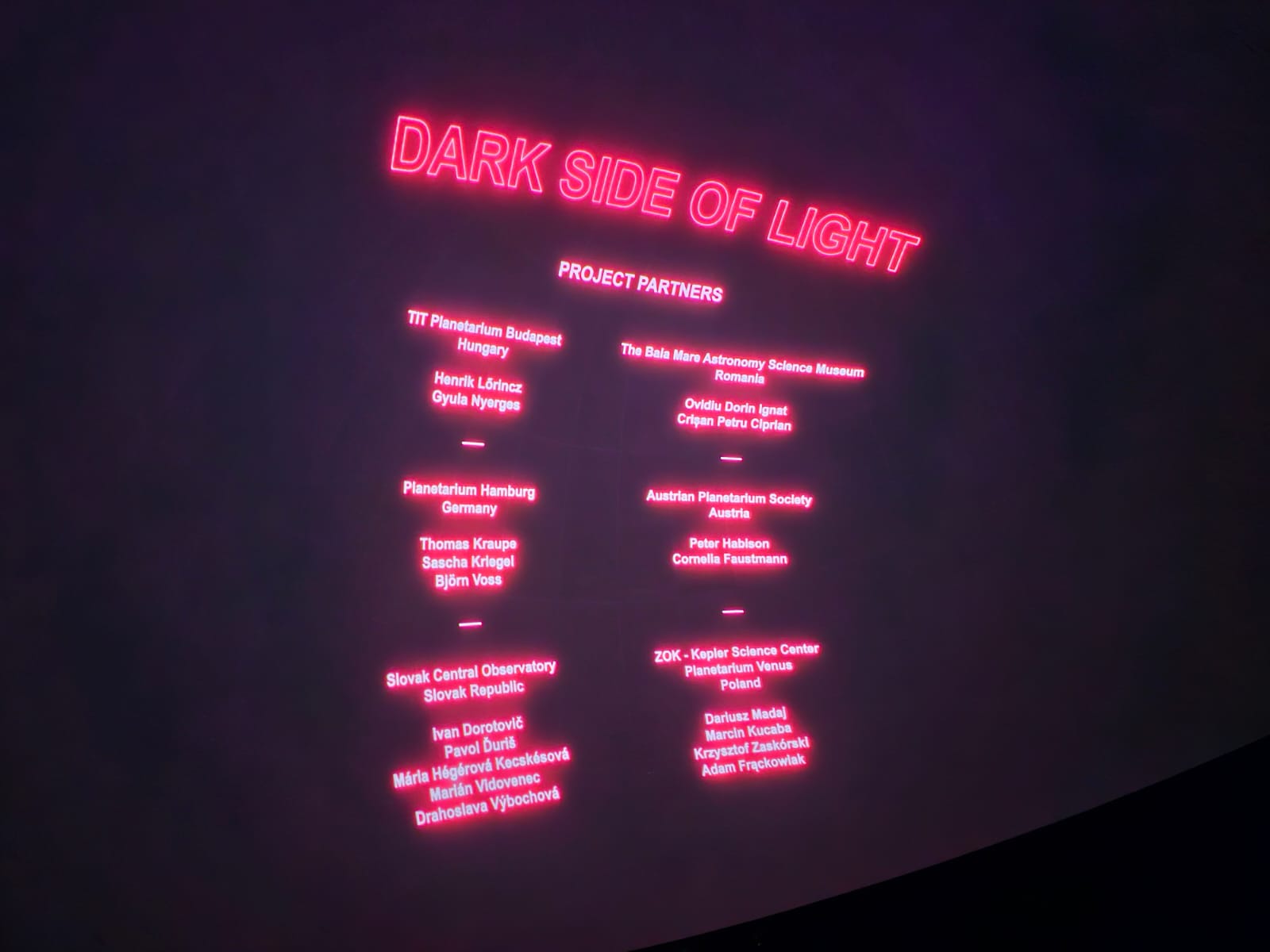 „Tot în această perioadă s-a desfășurat Festivalul Full Dome Brno, unde a fost lansat și produsul intelectual, respectiv spectacolul digital ”Dark Side of Light”, rezultat în urma proiectului cofinanțat de Comisia Europeană prin programul Erasmus+, proiect în care Muzeul de Științe Astronomice Baia Mare (Planetariul Baia Mare) a fost partener alături de câteva dintre cele mai importante planetarii din Europa: Planetariul și Observatorul Astronomic Brno – Republica Cehă, Planetariul Budapesta, Planetariul și Observatorul Astronomic din Hurbanovo – Slovacia, Asociația Planetariilor din Austria, Planetariul Venus din Zielona Gora – Polonia și PLanetariul Hamburg – Germania.