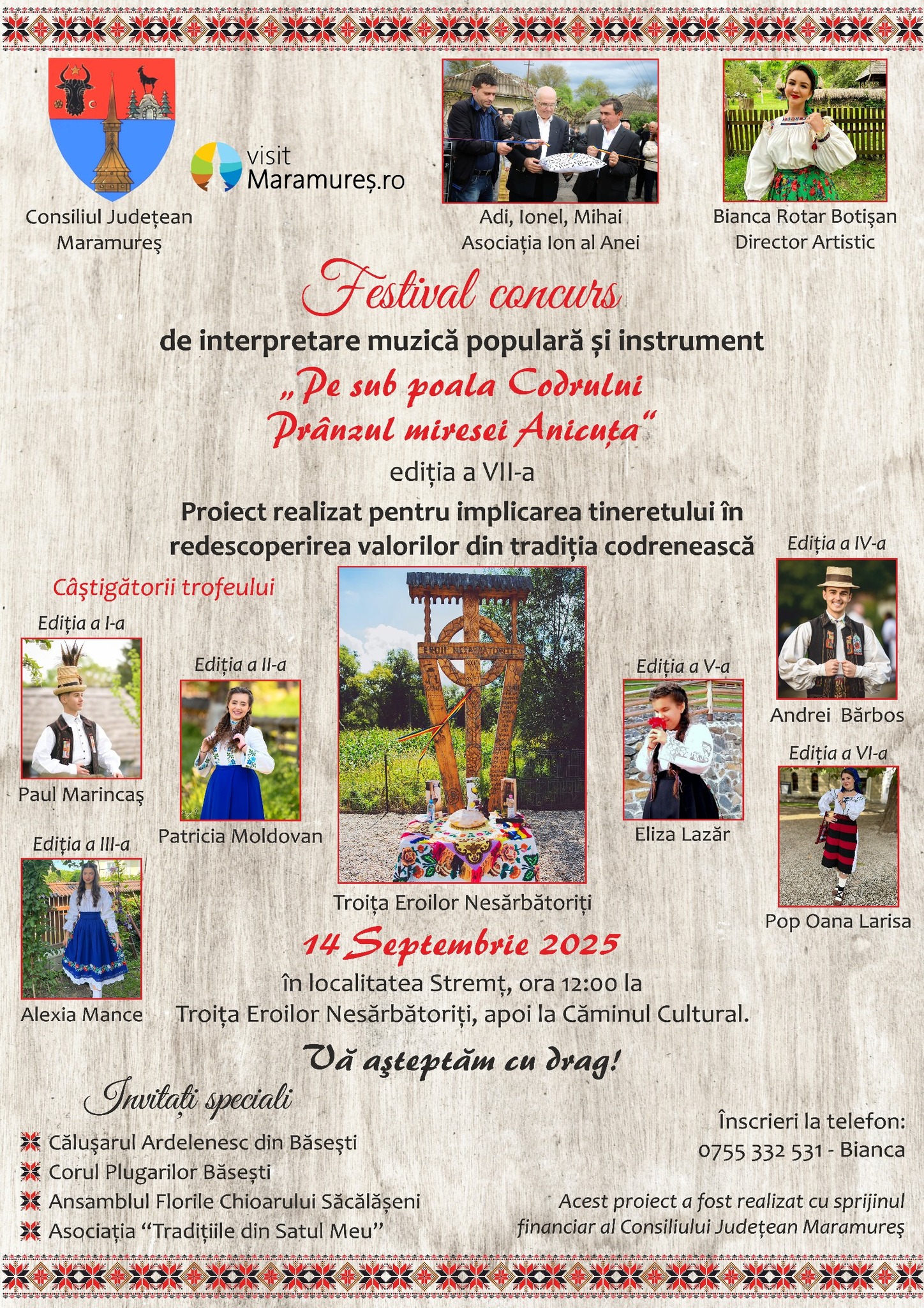 În 14 septembrie, în Stremț, comuna Băsești, se va desfășura ediția a VII-a a Festivalului concurs de interpretare muzică populară și instrument ,,Pe sub poala Codrului – Prânzul miresei Anicuța”.