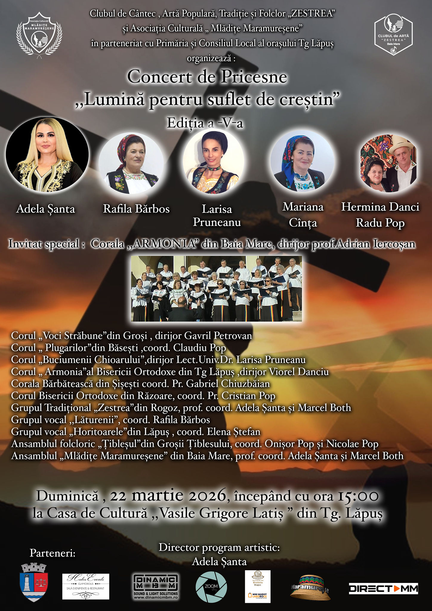 „Cu ajutorul lui Dumnezeu, ediția cu numărul V a concertului nostru de Pricesne Lumină pentru suflet de creștin se va desfășura pe data de 22 martie 2026, începând cu ora 15:00, la Casa de Cultură din Târgu Lăpuș, unde va așteptăm cu mare drag să fiți alături de noi si de invitații noștri speciali.