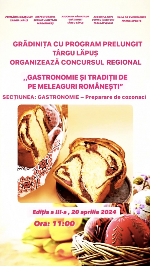 Sâmbătă, 20 aprilie, de la ora 11.00, Gradinița cu Program Prelungit Târgu Lăpuș organizează cea de-a III-a ediție a Concursului regional „Gastronomie și tradiții de pe meleaguri românești” – preparare de cozonaci.