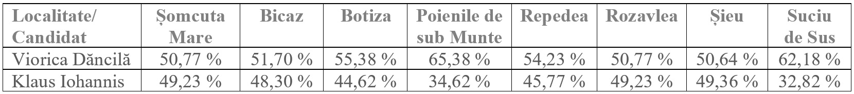 În primul tur, în două localități cu mulți etnici maghiari a câștigat candidatul UDMR, iar în turul doi s-a impus clar Klaus Iohannis: Câmpulung la Tisa (83,27% – 16,73%) și Coltău (80,8% – 19,2%) La Ulmeni, în primul tur a câștigat candidatul PMP, Theodor Paleologu, (45,89%), urmat de Kelemen Hunor (16,1%) și Klaus Iohannis (16,03) și era de așteptat ca în turul doi Klaus Iohannis să obțină un scor zdrobitor. Lucru care să fie adus ca argument la pretențiile la funcții publice pe care PMP (și pe care le aplaudă președintele PSD Maramureș, ca să se mai răcorească puțin). Nu a fost chiar așa: 60,64% (Iohannis) – 39,56% (Viorica Dăncilă), În plus Viorica Dăncilă a câștigat în Chelința (cu 51,18%) și detașat în Țicău (cu 69,7%). Ori alegătorii nu au priceput bine recomandarea primarului Lucian Morar, ori acesta a mers la două capete, că nu se știe cum vor fi vremurile.