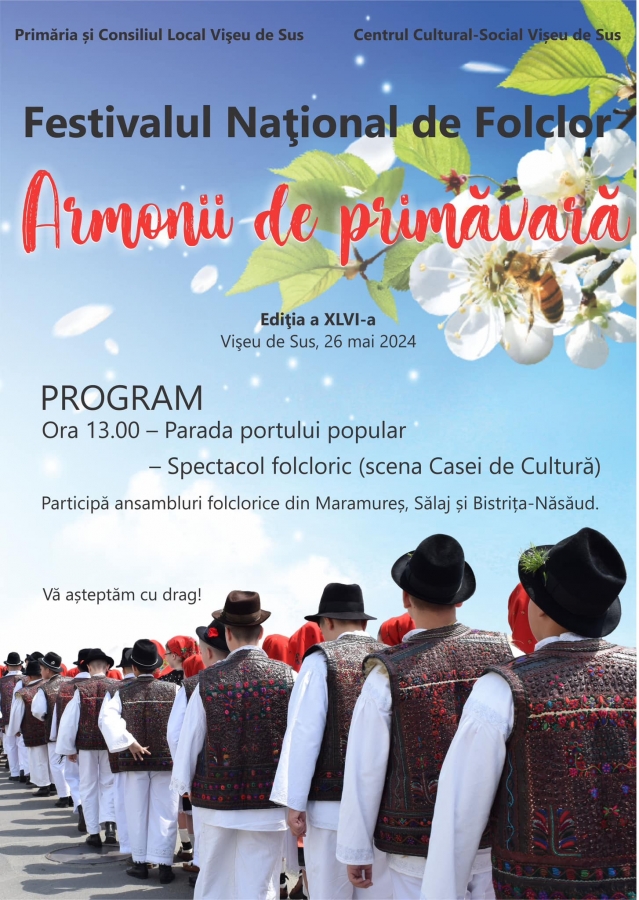 Duminică, 26 mai, în Vișeu de Sus se va desfășura Festivalul Național de Folclor „Armonii de primăvară”, ediția a XLVI-a.