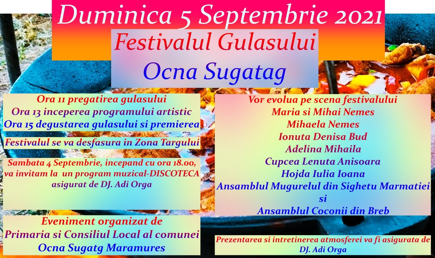 „Duminică 5 septembrie vă invităm la Festivalul Gulașului. Festivalul are loc în localitatea Ocna Șugatag zona Târgului, unde bucătari amatori și profesioniști se întrec în prepararea celui mai gustos gulaș. După degustarea bucatelor are loc premierea câștigătorului, iar mâncarea trebuie musai „udată” cu horincă”, este mesajul organizatorilor.