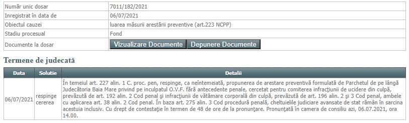 La data de 06.07.2021 dosarul a fost înaintat instanţei cu propunere de arestare preventivă a inculpatului pentru 30 de zile, cerere respinsă de judecătorul de drepturi şi libertăţi de la Judecătoria Baia Mare. Împotriva încheierii judecătorului de drepturi şi libertăţi Parchetul de pe lângă Judecătoria Baia Mare a formulat contestație. Precizăm că punerea în mişcare a acţiunii penale este o etapă a procesului penal reglementată de Codul de procedură penală având ca scop crearea cadrului procesual de administrare a probatoriului, activitate care nu poate, în nici o situaţie, să înfrângă principiul prezumţiei de nevinovăţie”, se arată în comunicatul Parchetului de pe lângă Judecătoria Baia Mare.