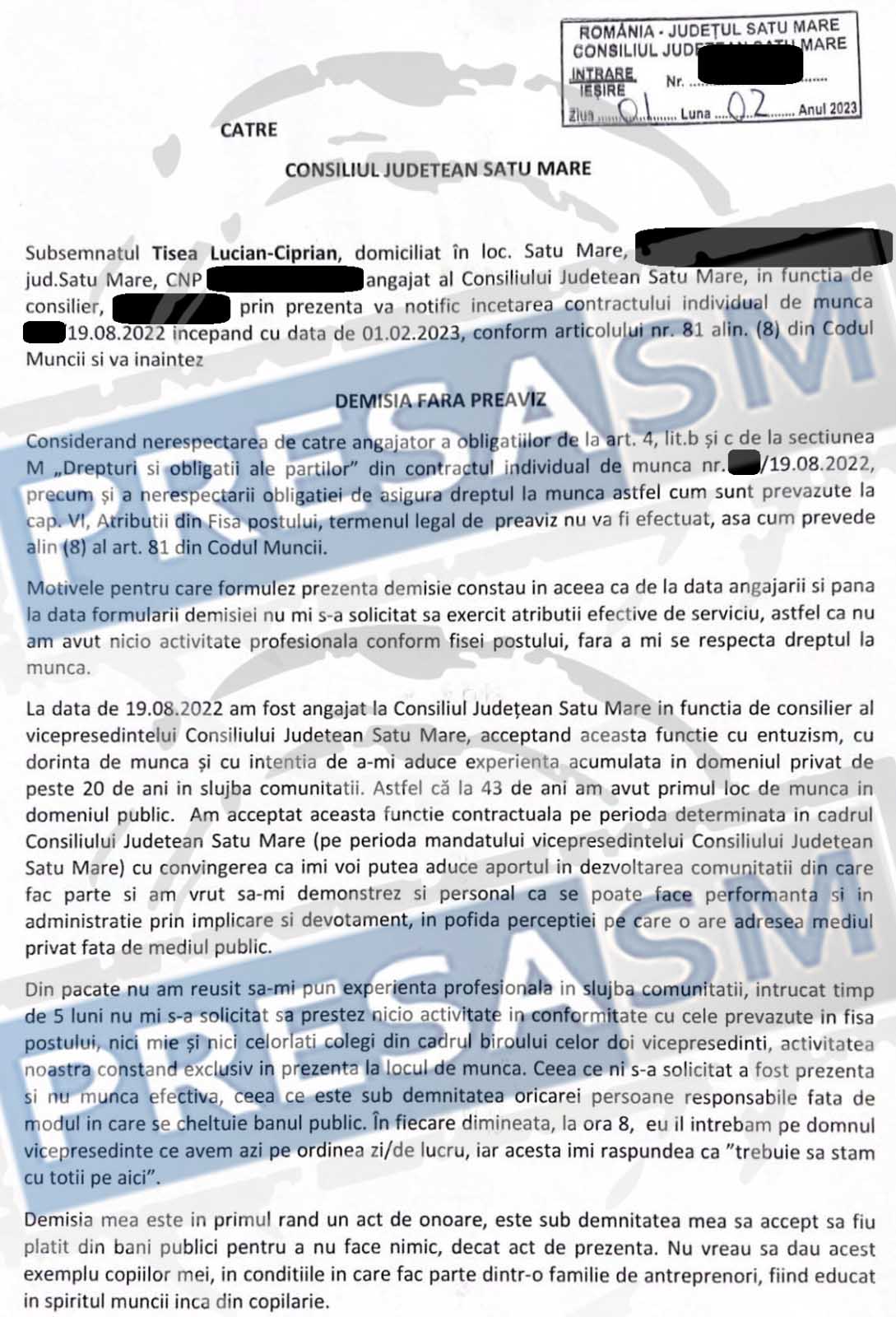 O demisie de răsunet în Consiliul Județean Satu Mare! Ciprian Tișea, un consilier de la cabinetul vicepreședintelui Consiliului Județean Satu Mare, Oliviu Buzgău, și-a dat demisia în semn de protest fiindcă nu avea nimic de muncă în toată perioada în care a fost angajat. Și pentru care a fost plătit cu 6.500 de lei/lunar!