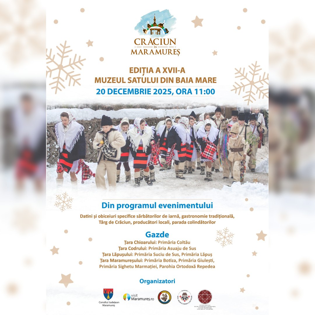 Sâmbătă, 20 decembrie, începând cu ora 12:00, Muzeul Satului din Baia Mare va deveni din nou locul în care tradițiile de iarnă prind viață, iar Maramureșul își deschide larg porțile pentru toți cei care vor să simtă magia sărbătorilor în forma lor originală.